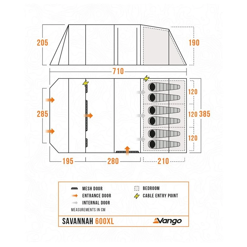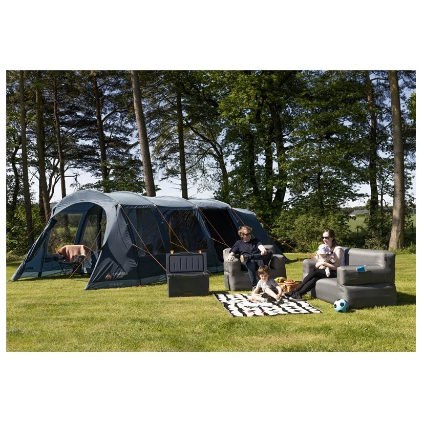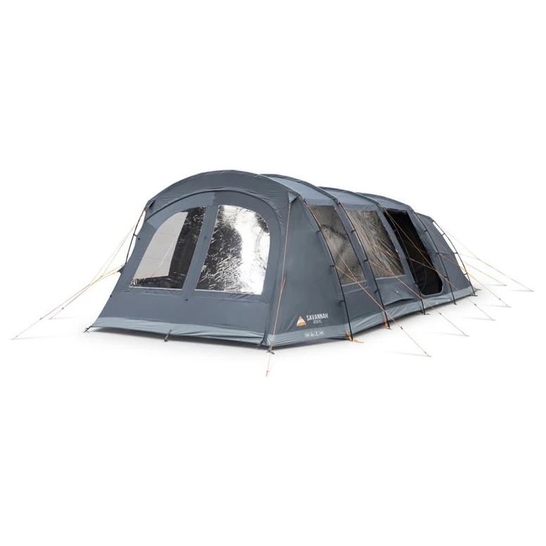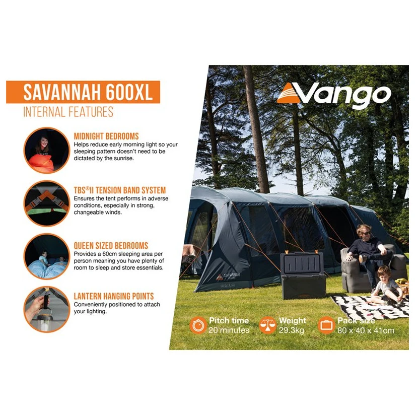 Das Savannah 600XL Paketzelt ist ideal für 6 Personen und besteht aus PowerFlex®-Fibreglasstangen, die leicht und sehr langlebig sind. Im Inneren des Zeltes finden wir drei Kabinen, die durch den Toggled Inner Divider – ein Hakenbefestigungssystem – getrennt werden können. Die Schlafzimmer sind mit Nightfall-Stoff ausgestattet, der das Tageslicht abhält und so ideale Bedingungen für eine erholsame Nachtruhe schafft. Der geräumige Wohnbereich ist in zwei Teile unterteilt und bietet viel Platz für einen Campingtisch oder andere Möbel.
