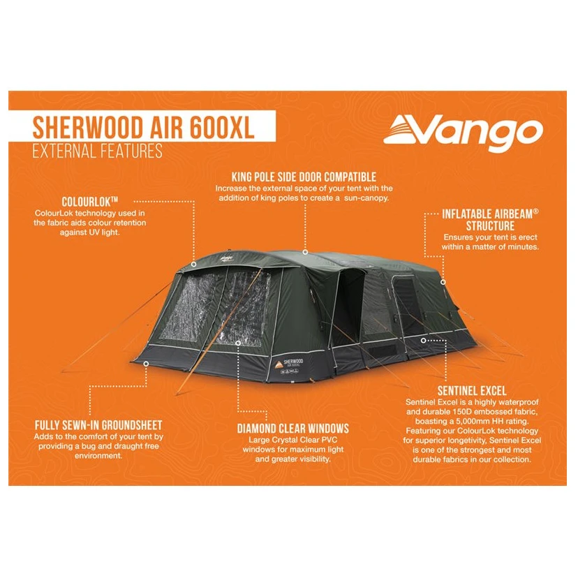 Das Vango Sherwood Air 600XL-Paket ist ein großes aufblasbares Familienzelt für 6 Personen, das dank AirBeam®-Technologie einen einfachen und schnellen Aufbau mit hervorragendem Komfort und Haltbarkeit verbindet. Mit Hochdruck aufblasbare Schläuche sorgen für Stabilität und Festigkeit, sogar bei anspruchsvolleren Wetterbedingungen, während der Aufbau des Zeltes nur wenige Minuten dauert.