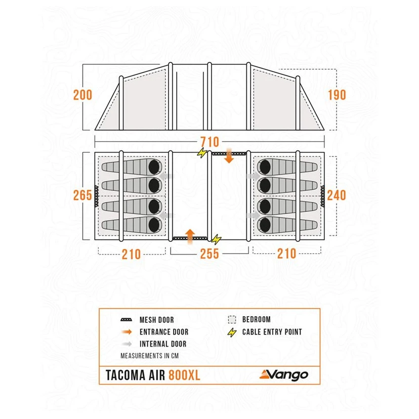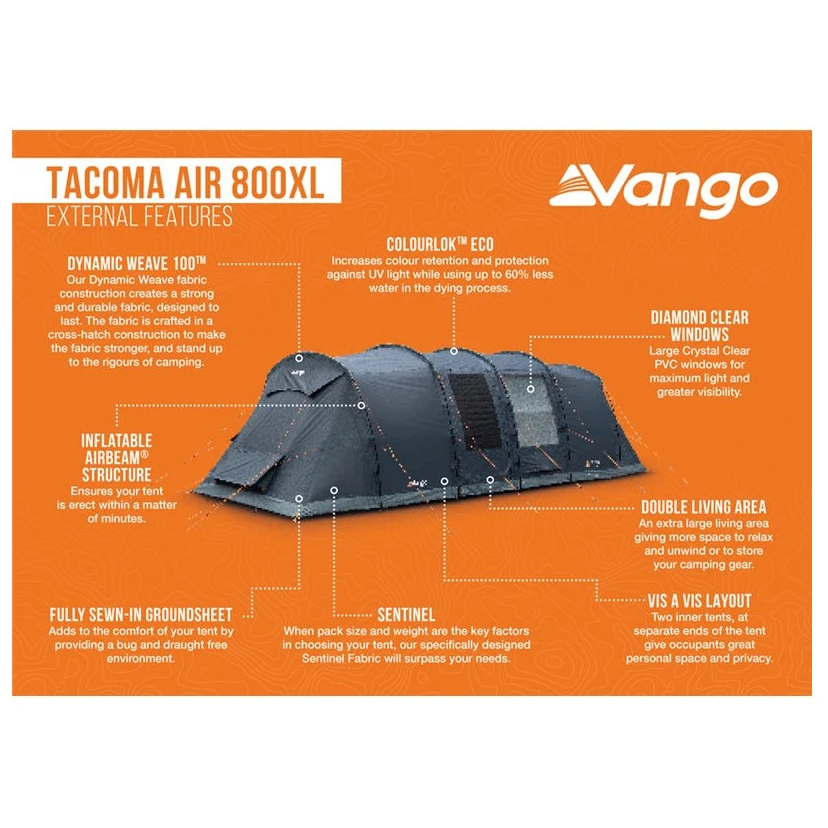 Das Vango Tacoma Air 800XL Paketzelt ist die ideale Wahl für Familien oder Gruppen von bis zu 8 Personen, die ein geräumiges und komfortables Campingerlebnis suchen. Dieses Modell nutzt die AirBeam®-Technologie, wodurch sich das Zelt schnell und einfach ohne herkömmliche Fiberglasstangen aufbauen lässt. Dieses Modell bietet separate Schlafzimmer für mehr Privatsphäre und Komfort. Jedes Schlafzimmer ist für bis 4 Personenausgelegt und bietet ausreichend Platz und Privatsphäre für verschiedene Familien- oder Freundesgruppen.
