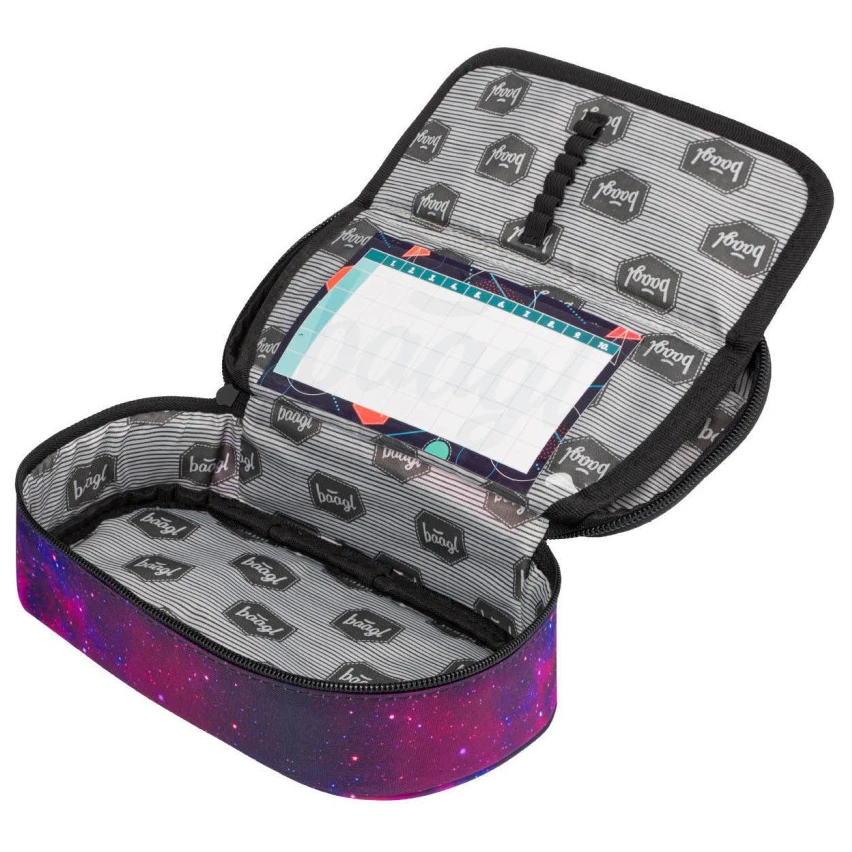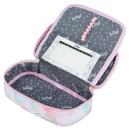 Das feste Schüleretui Etui der tschechischen Marke Baagl ist für Mädchen und Jungen geeignet. Das Etui hat einen Reißverschluss, eine doppelte Klappe, praktische Gummibänder, eine Reißverschlusstasche und ein Fach für den Stundenplan im Inneren.
