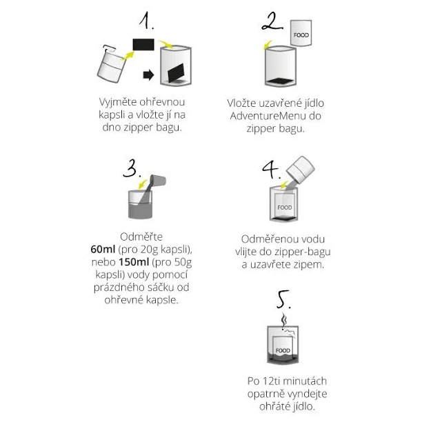 - Möglichkeit zum Erhitzen von Speisen ohne Verwendung von Feuer, Herd oder Utensilien durch Verwendung einer selbsterhitzenden Kapsel