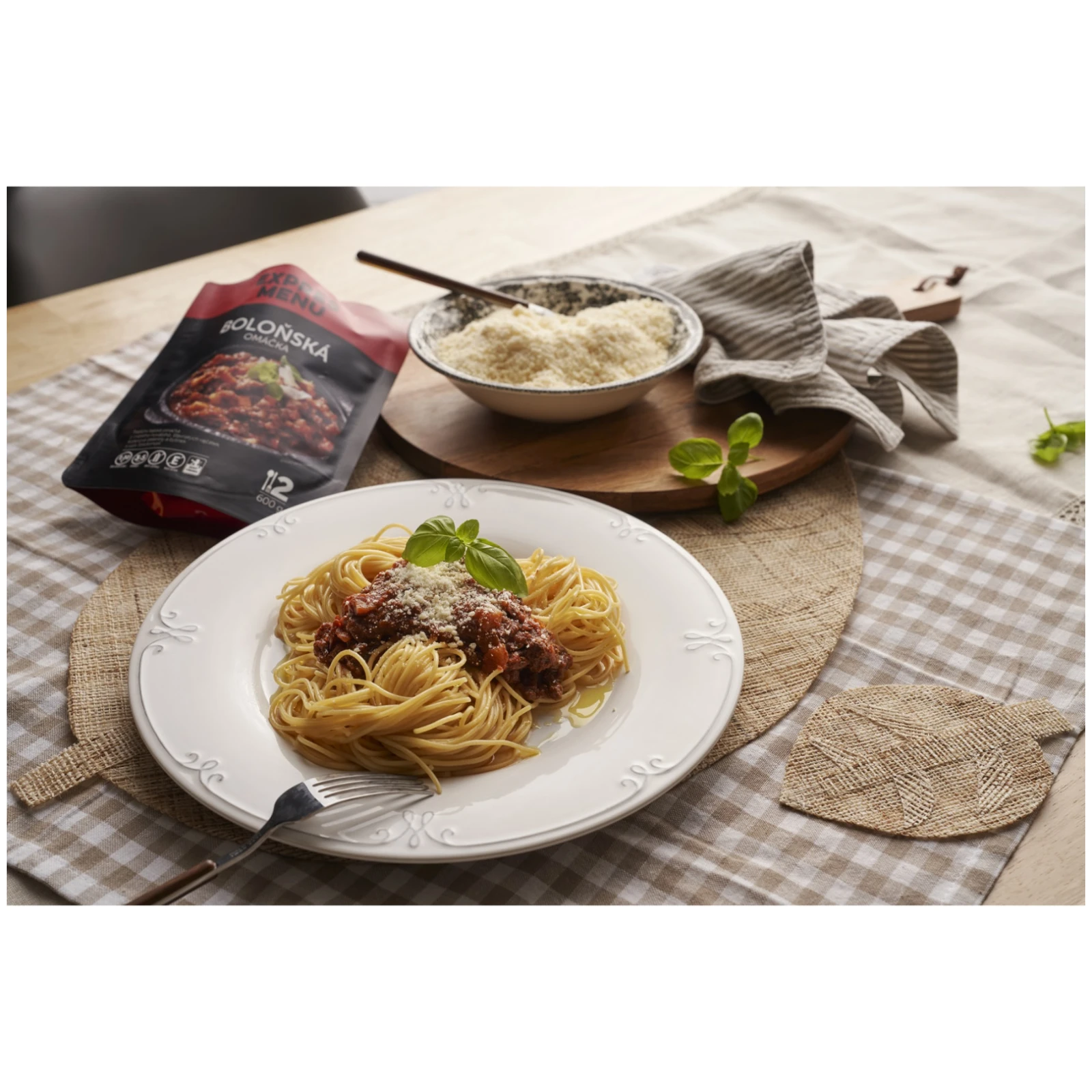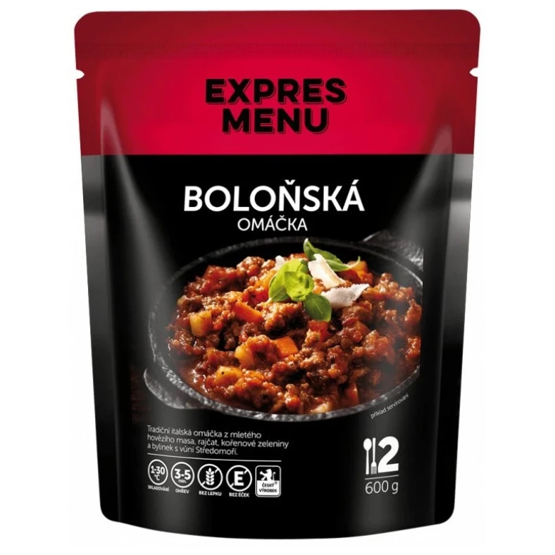 Verzehrfertiges sterilisiertes Essen von Expres Menu, hergestellt ohne Konservierungsstoffe und nur aus den besten Zutaten, begeistert jeden Spaghetti-Liebhaber, der seine Soße nicht selbst zu Hause zubereiten kann, aber dennoch auf ehrliches Essen aus hochwertigen, nicht gentechnisch veränderten Zutaten setzt.