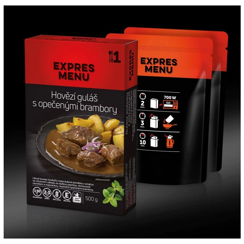 Die sterilisierten Fertiggerichte Express Menu tschechischer Herkunft sind ideal für Reisen, für Urlaube am Meer und in den Bergen, auf einer Yacht oder einem Boot, für Hüttenbewohner, für Familien mit Kindern und für Senioren oder auch als schnelle Mahlzeit zu Hause (wenn z.B. unangekündigter Besuch kommt und man ihn mit einem warmen Abendessen überraschen möchte).
