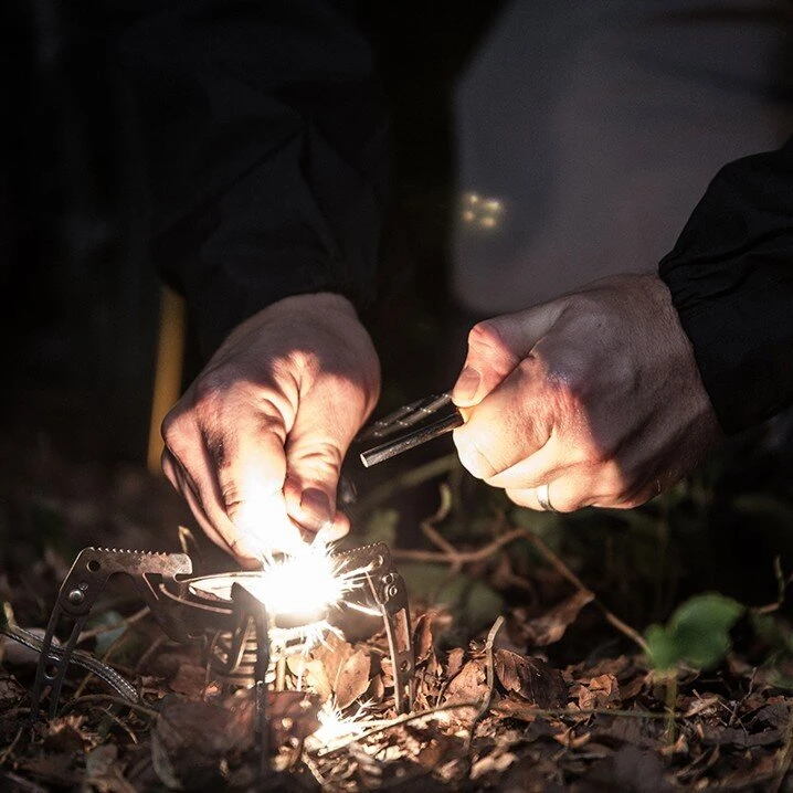 Leichter, zusammenklappbarer Feuerstein Lifesystems Lifesystems Dual Action Firestarter mit einem Paar Zündstäben, die eine sichere und sehr einfache Verwendunggarantieren. Der erste Schneidstab besteht aus Ferroceria, einer Legierung aus Ceroxid, Lanthan und Eisen. Durch Reibung können Funken mit einer Temperatur von 2980 °C entstehen. Der zweite Stab besteht aus Magnesium und dient nach dem Anritzen als Anzündeholz. Der Feuerstein erzeugt Funken bei jedem Wetter.