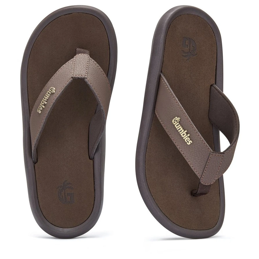 Die Gumbies Noosa Brown Herren Zehentrenner passen sich mit ihrer Form dem Fuß an und haben eine hervorragende Haftung. Ein weiterer Vorteil ist das angenehme Baumwollfußbett und der weiche Riemen, der nicht zwischen den Zehen reibt.