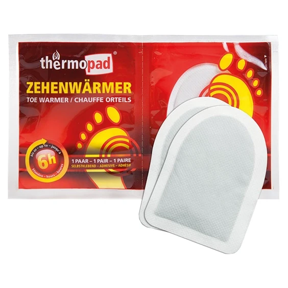 Zehenwärmer Das Thermopad der Marke Yate dient vor allem zum Wärmen der Zehen bei schlechtem Wetter. Dadurch werden Erkältungen und mögliche Verletzungen des Anwenders vermieden. Das Heizgerät reagiert bei Kontakt mit Sauerstoff, weshalb das Aufheizen eine gewisse Zeit dauert. Die Lebensdauer beträgt (je nach Umgebungsbedingungen) bis zu 6 Stunden und ist zum einmaligen Gebrauch bestimmt. Die Maße des Heizgerätes betragen 9,5x6,5 cm. Im Paket ist immer ein Paar enthalten.