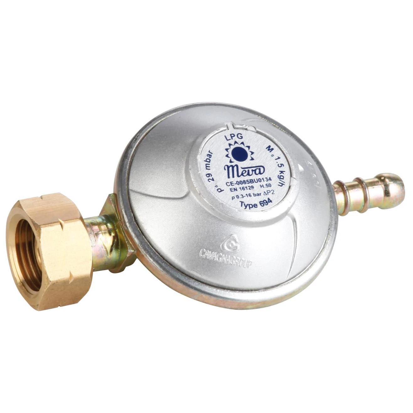 Gasdruckregler Meva 30 mbar NP01008, der mit einem Dorn zum direkten Anschluss an den Gasschlauch endet.