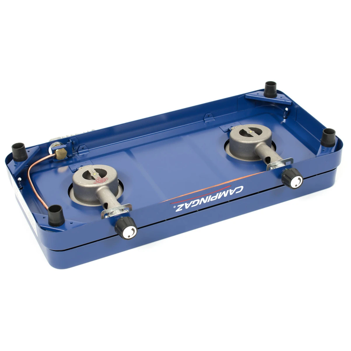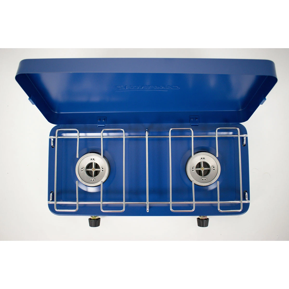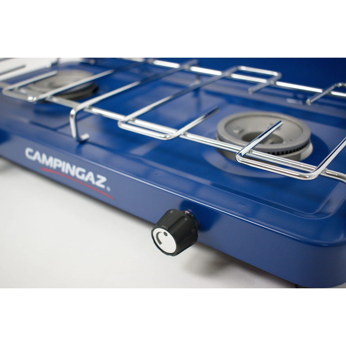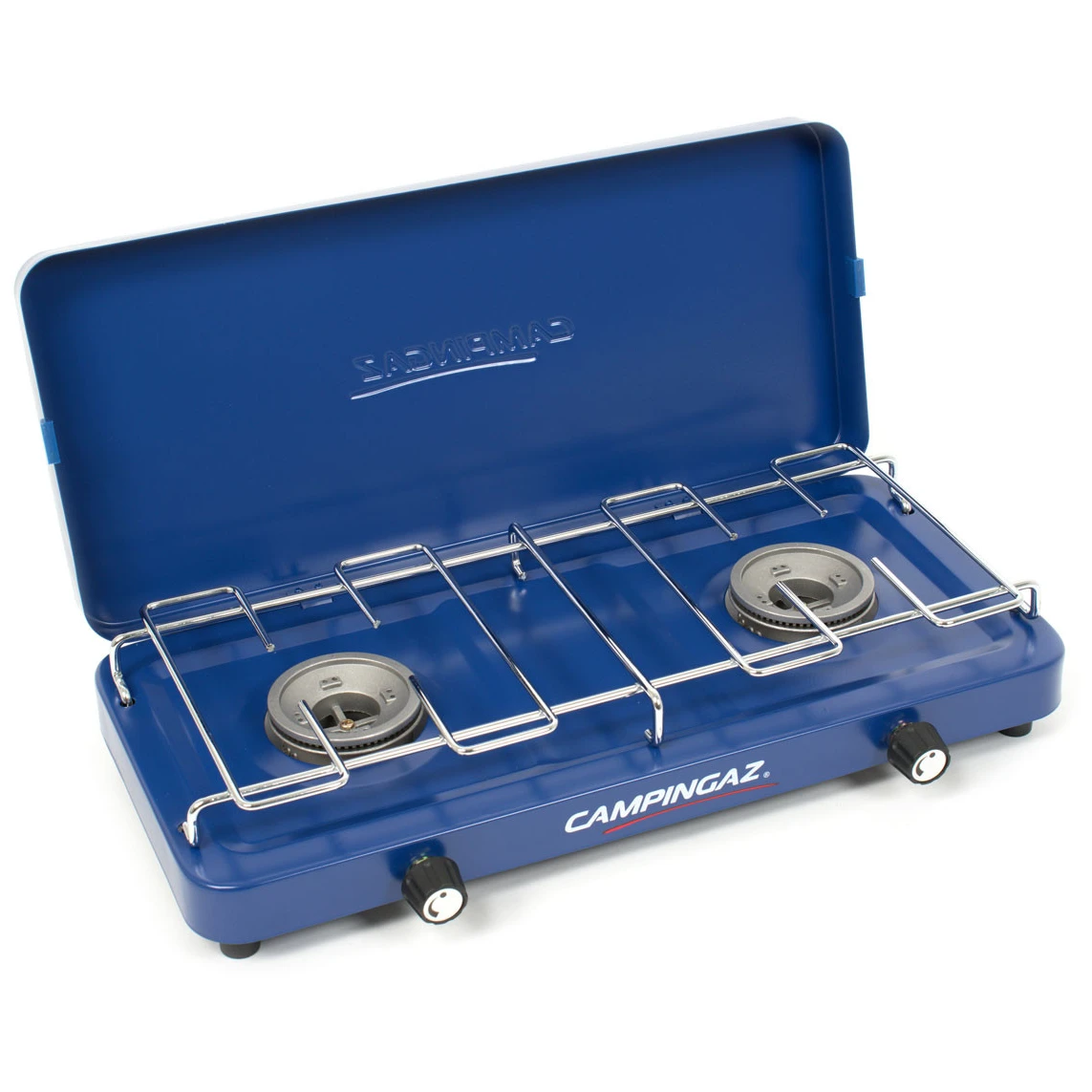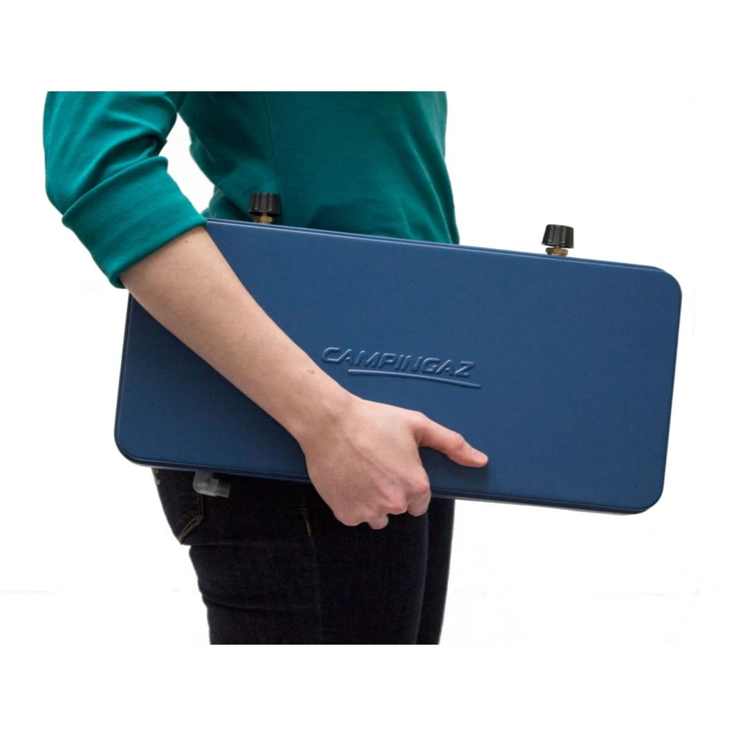 Ein einfacher Zwei-Flammen-Gaskocher mit Base Camp-Deckel der Premium-Campingmarke Campingaz. Der Deckel dient als Unterstand und schützt den Kocher beim Transport. Zwei separate, leistungsstarke Brenner sind vielseitiger als nur einer. Alle Komponenten können im Inneren des Kochers verstaut werden, was den Transport erheblich erleichtert. Es funktioniert mit einer herkömmlichen 2-kg- oder 10-kg-PB-Flasche.