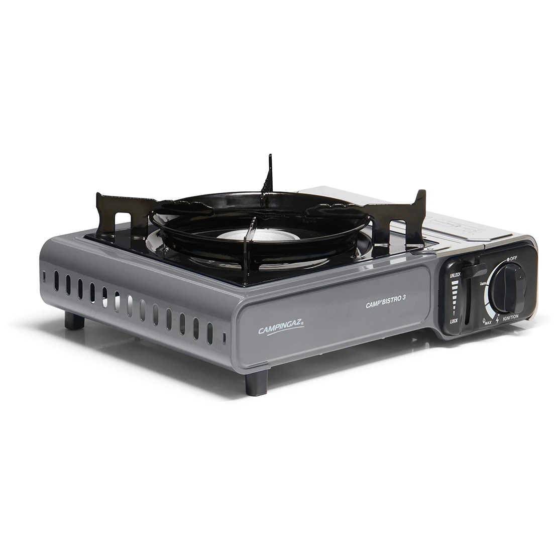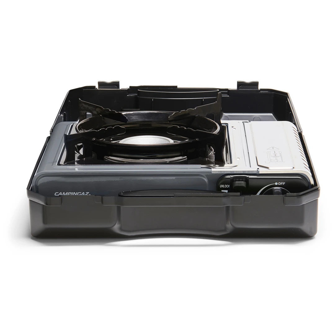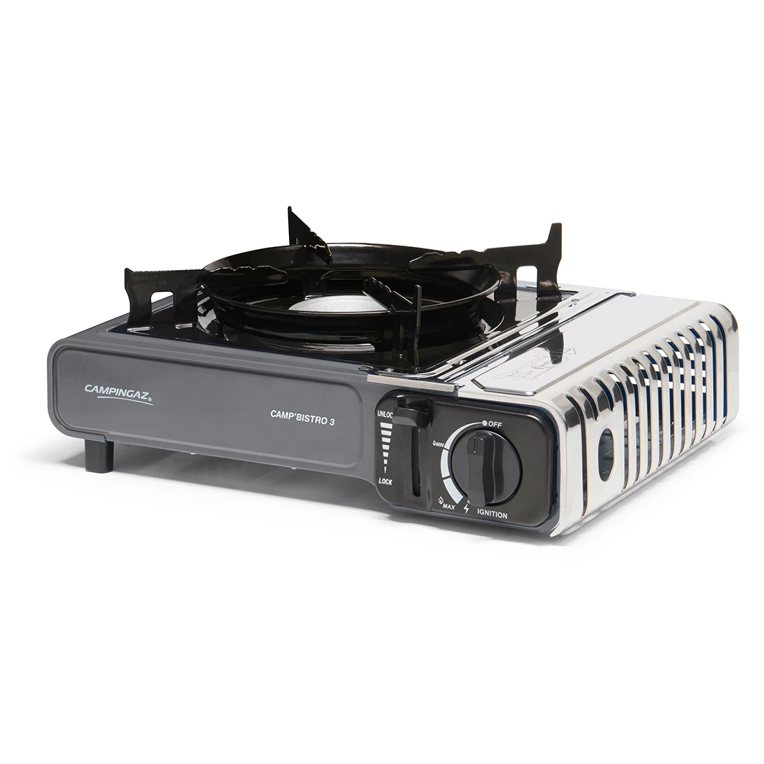 Die neueste Version des erfolgreichen Campingaz® Camp'Bistro 3-Gaskochers mit zwei integrierten Sicherheitssystemen, einer Kartuschenabdeckung aus Edelstahl und einer verbesserten Topf- und Pfannenhalterung, die für Stabilität sorgt und die Flamme vor Wind schützt. Der gesamte Herd steht stabil , auch bei Verwendung größerer Töpfe. Der Ofen ist für einfachen Transport und Lagerung in einem eigenen Kunststoffkoffer untergebracht. Die Kartuschenabdeckung ist aus Edelstahl gefertigt, der vergrößerte Zwischenraum und die vergrößerten Löcher helfen, eine Überhitzung zu vermeiden. Doppelte Sicherung zur Begrenzung des Gasflusses und zum Auswerfen der Kartusche bei Überhitzung.