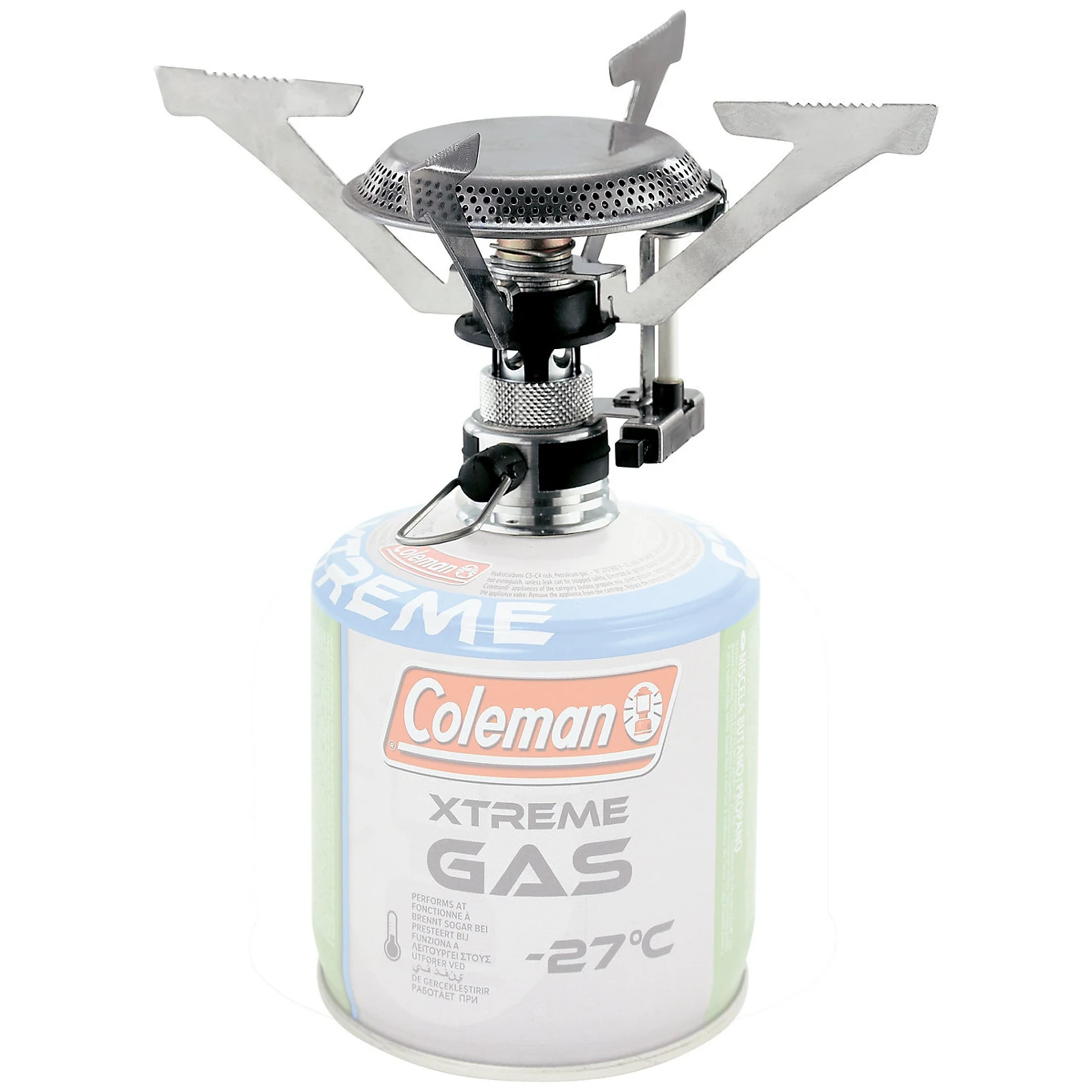 Leistungsstarker Touristen- Gaskocher FyrePower PZ der Marke Coleman, der das Kochen in größeren Behältern bei widrigen Wetterbedingungen bewältigt. Der Ofen ist sehr widerstandsfähig gegen Wind und funktioniert selbst unter härtesten Bedingungen einwandfrei. Es eignet sich perfekt für ein Paar Esser, eine Expedition mit mehreren Teilnehmern und eine Touristenfamilie. Sehr kompakt, wird mit einer Textil-Tragetasche geliefert.