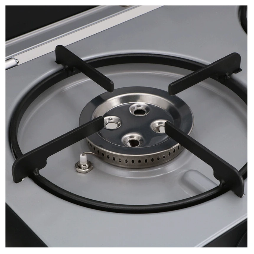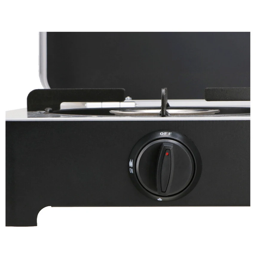 Dieses Modell ist außerdem mit einer elektrischen Zündung ausgestattet, sodass das Anzünden der Brenner nur eine Sekunde dauert, und einer Flammenausfall-Sicherung (FFD) – falls die Flamme erlischt, wird die Gaszufuhr automatisch unterbrochen. Dank des abnehmbaren Windschutzes bleibt die Flamme auch bei starkem Wind geschützt, und gleichzeitig lässt sich der Kocher leicht zusammenlegen oder verstauen.