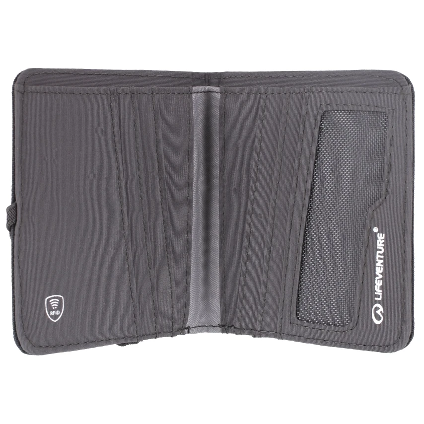 Lifeventure RFiD Compact Wallet ist eine kompakte Geldbörsemit vollem Funktionsumfang. Im Inneren finden Sie 6 Kartenfächer sowie eines mit transparentem Fenster für Ihren Personalausweis, 2 Fächer für andere Dinge und schließlich ein Fach für Geldscheine. Es besteht aus strapazierfähigem Nylonmaterial mit PU-Beschichtung. Verschlossen wird die Geldbörse mit einem Gummiband.