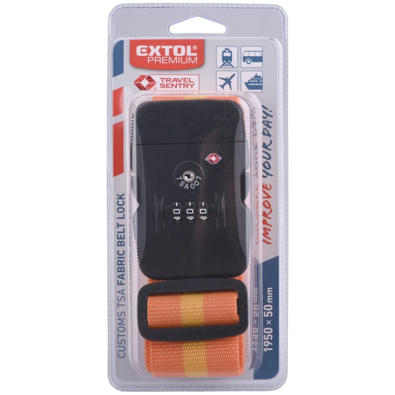 Der Gepäckgurt der Marke Extol verfügt über ein TSA-Schloss mit dreistelligem Code, welches Ihr Gepäck in Risikogebieten vor Diebstahl schützt.