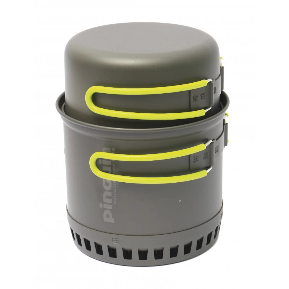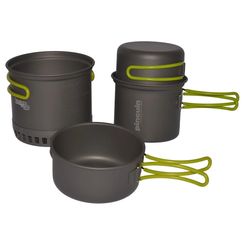Kochgeschirr-Set Pinguin Doppel-X mit Wärmetauscher aus gehärtetem Aluminium. Passend für 2 Personen, im praktischen Stoffbeutel mit Kordelzug. Die Oberfläche ist mit einer Eloxalschicht versehen, die eine feuer- und abriebfeste Beschichtung aufweist. Enthält 2 größere und 2 kleinere Töpfe, die als Deckel verwendet werden können. Das Set ermöglicht den sicheren Transport einer Gaskartusche und eines kleinen Kochers im Behälter. Kartuschen und Kocher sind nicht im Lieferumfang enthalten.