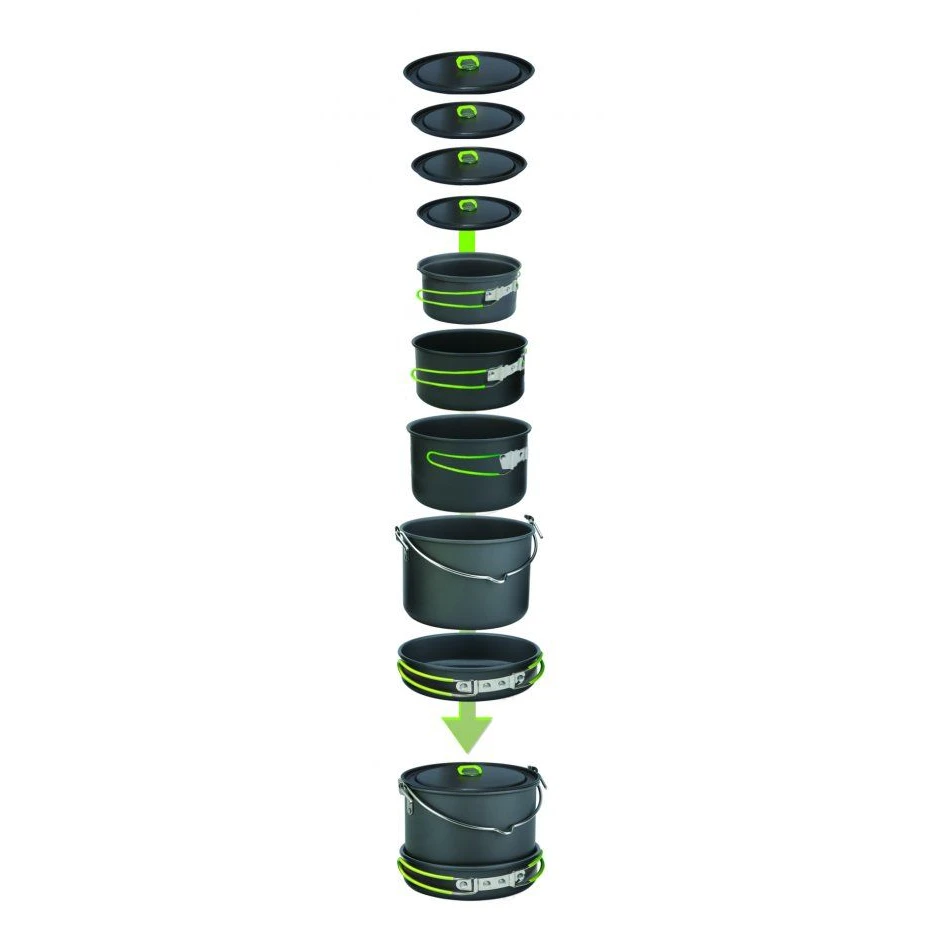 Die Klappgriffe bestehen aus Stahldraht und sind mit einem hitzebeständigen Silikonschlauchummantelt. Die Deckelgriffe sind aus Kunststoff. Das Geschirr lässt sich nach dem Kochen schnell und einfach abwaschen. Das Set besteht aus 4 Töpfen und einer Pfanne sowie 3 Tellern, 6 Schüsseln, einer Schöpfkelle und einem Löffel. Zu guter Letzt enthält das Set auch einen Spülschwamm. Sie können das gesamte Set (im größten Topf) zusammenstellen und es dann in den im Lieferumfang enthaltenen Netzbeutel geben.