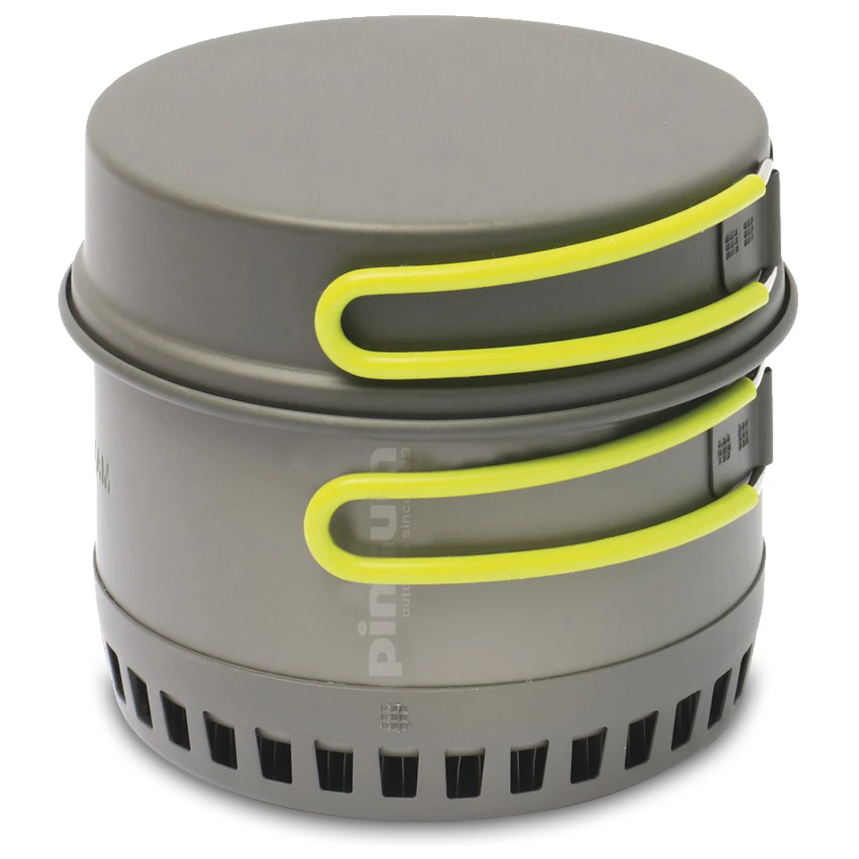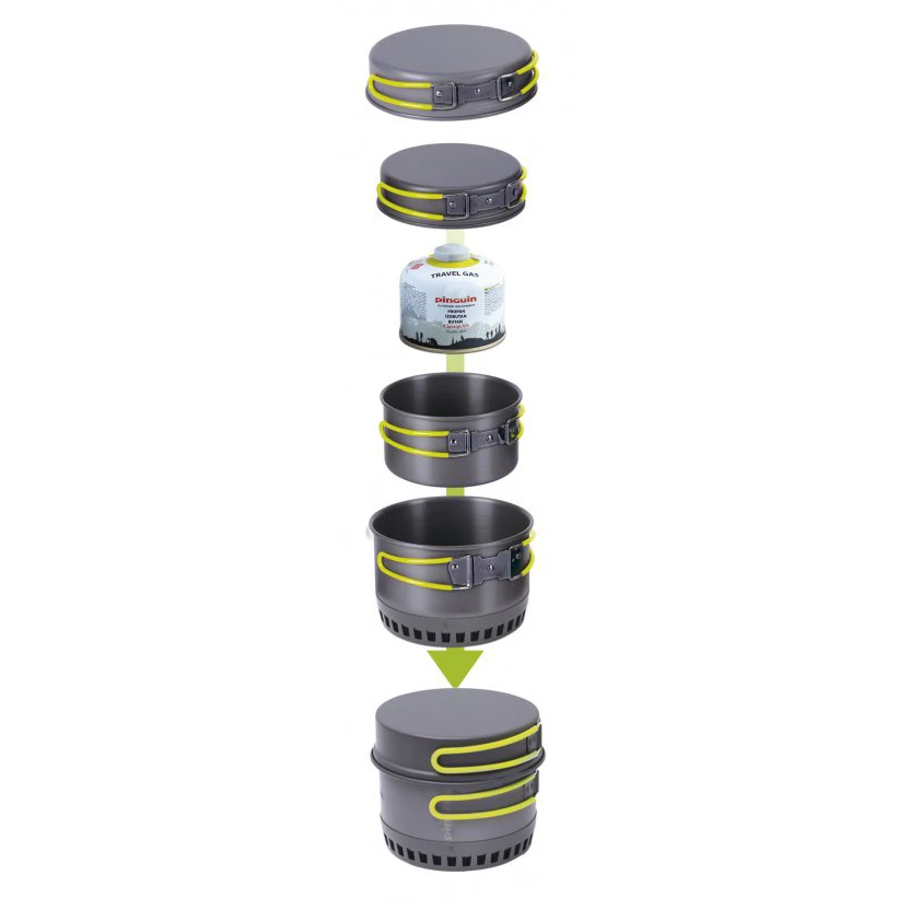 Kochgeschirr-Set mit Wärmetauscher aus gehärtetem Aluminium geeignet für 3–5 Personen. Die Oberfläche ist mit einer Eloxalschicht versehen, die eine feuer- und abriebfeste Beschichtung aufweist. Im größten Topf lässt sich alles stapeln. Die Kartusche ist nicht im Lieferumfang enthalten.