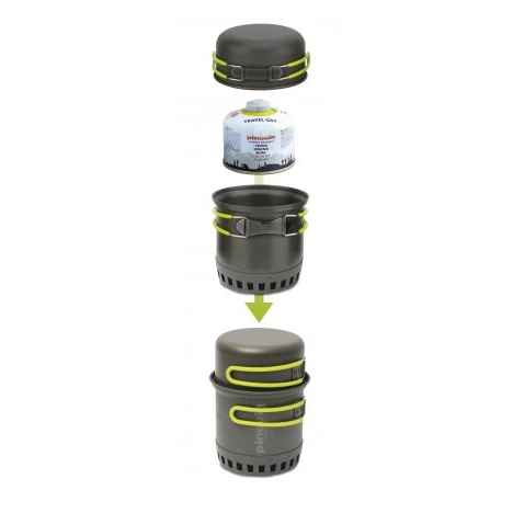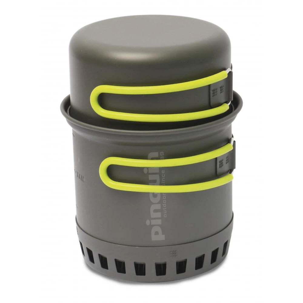 Kochgeschirr-Set mit Wärmetauscher aus gehärtetem Aluminium. Geeignet für 1 Person. Die Oberfläche ist mit einer Eloxalschicht versehen, die eine feuer- und abriebfeste Beschichtung aufweist. Enthält 1× größeren + 1× kleineren Topf, der als Deckel verwendet werden kann. Das Set ermöglicht den sicheren Transport einer Gaskartusche und eines kleinen Kochers im Behälter. Kocher und Kartusche sind nicht im Lieferumfang enthalten.