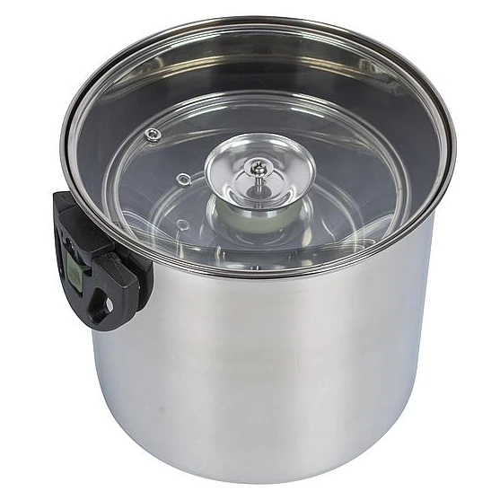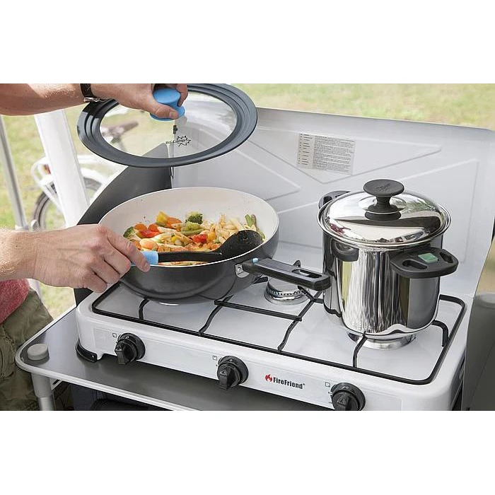 Das luxuriöse Set Edelstahl-Töpfe Elegance Compact 3 von Bo-Camp sind eine ideale Wahl für mehrtägige Ausflüge in die Natur. Das Set besteht aus einem großen 6 Liter Topf, einem mittleren 3 Liter Topf und einem kleinen 1,25 Liter Topf. Sie verfügen alle über klappbare Griffe, die hitzebeständig sind. Durch das Einklappen der Tragegriffe können Sie bis zu 40% Platz sparen. Dank der schmalen und hohen Form eignen sich die Töpfe hervorragend für beengte Stellflächen auf Gasbrennern. Sie sind jedoch auch für den Einsatz auf Ceran- und Elektroherden geeignet.