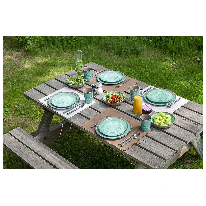 Luxuriöses 12-teiliges Set aus 100 % Melamin der niederländischen Firma Bo-Camp. Melamingeschirr ist praktisch unzerbrechlich und sehr leicht. Außerdem ist das Geschirr kratzfest und spülmaschinenfest. Dieses stilvolle Set ist für 4 Personen geeignet und besteht aus 4 Frühstückstellern, 4 Speisetellern und 4 Schüsseln.
