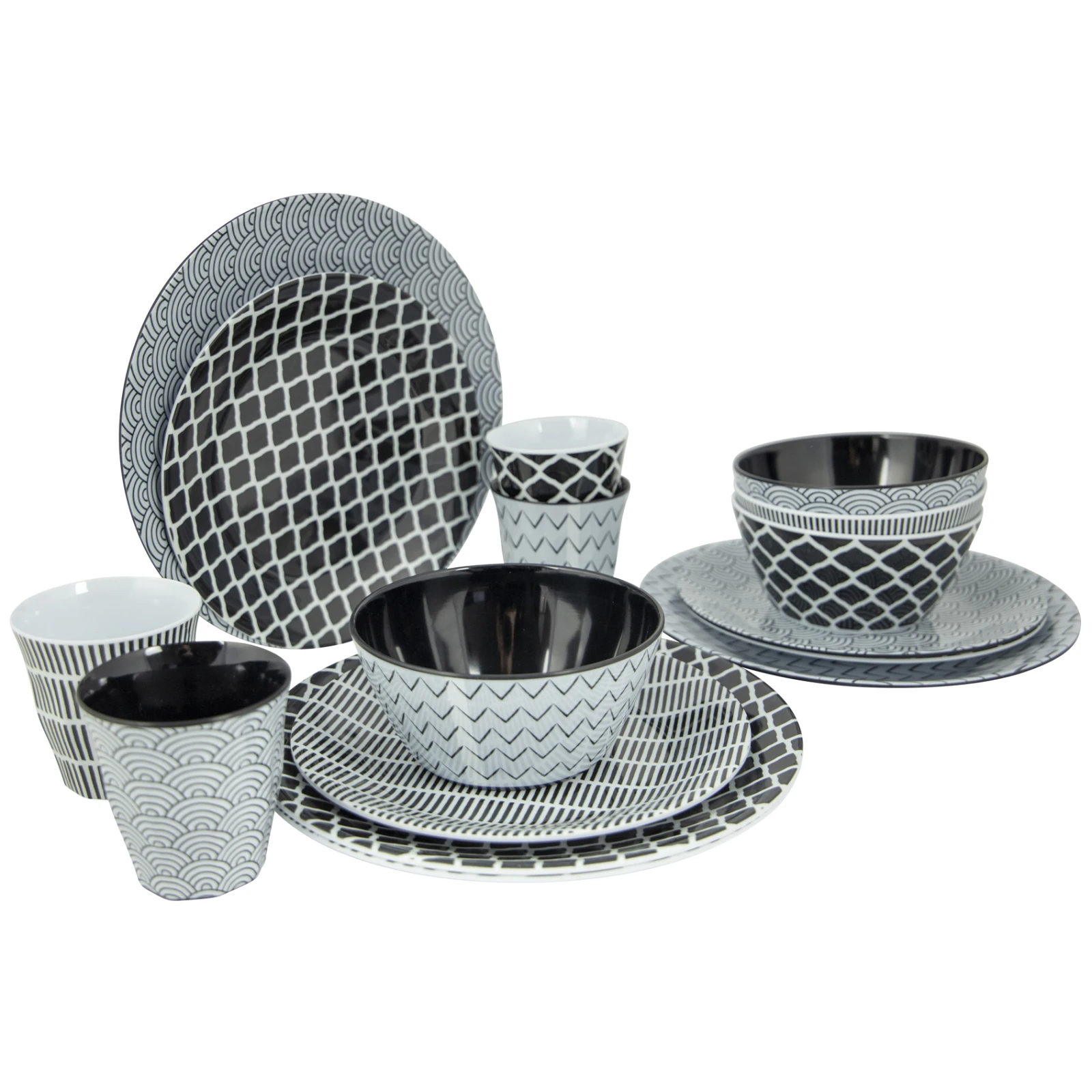 Luxuriöses und modernes 16-teiliges Mix & Match 16-Geschirrset aus 100 % Melamin der niederländischen Firma Bo-Camp. Bestehend aus 4 Frühstückstellern, 4 Speisetellern, 4 Schüsseln und 4 Bechern