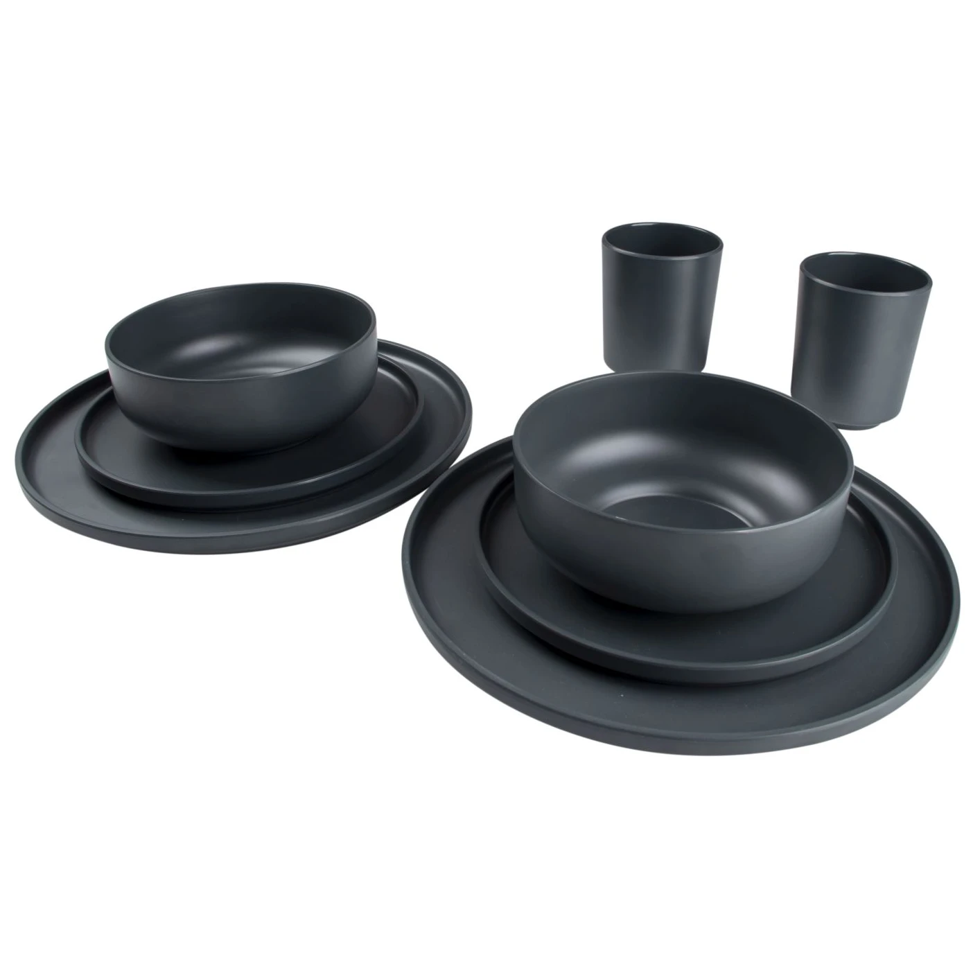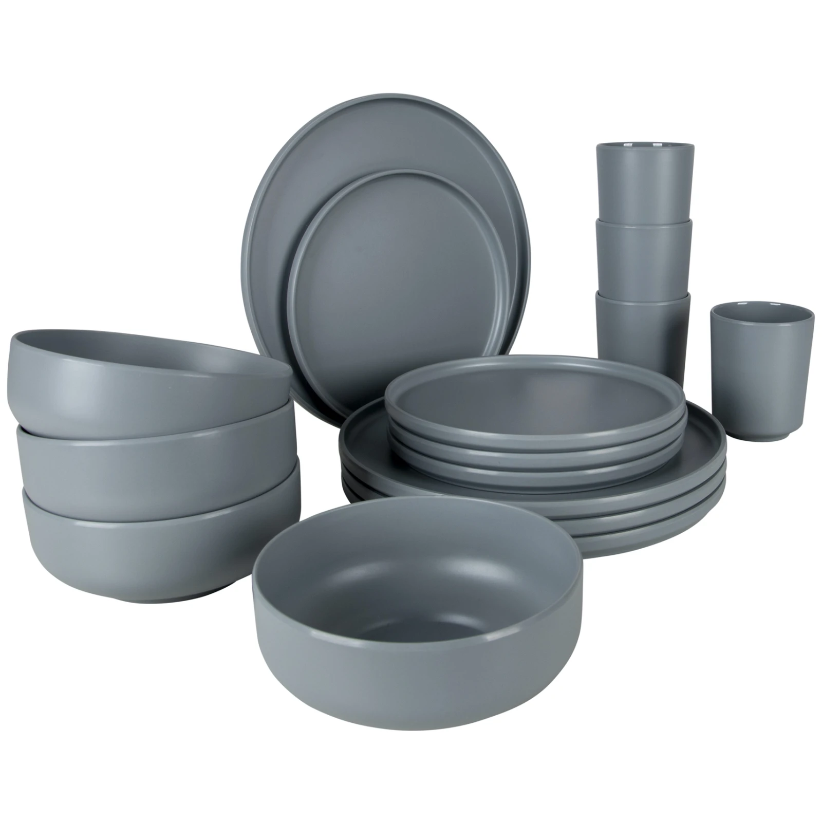 Modernes 16-teiliges Tafelservice der Marke Patom Bo-Camp mit senkrechtem Rand und aus 100% Melamin. Melamingeschirr ist praktisch unzerbrechlich, sehr leicht, kratzfest und spülmaschinenfest. Geeignet für 4 Personen und besteht aus 4 Tellern, 4 Frühstückstellern, 4 Schüsseln, 4 Bechern. Ideal zum Mitnehmen zum Camping oder in den Garten.