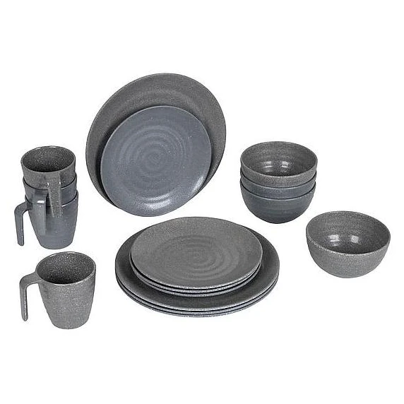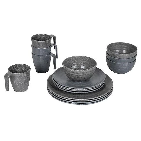 Das 16-teilige Geschirr-Set Tableware Stone von Bo-Camp mit wunderschönem Steinmuster ist eine ideale Wahl fürs Camping. Das Set besteht aus 100 % Melamin und ist daher sehr leicht, kratzfest und nahezu unzerbrechlich. Das Set besteht aus 4 großen Tellern, 4 kleinen Tellern, 4 Suppenschüsseln und 4 Bechern. Das Set ist spülmaschinenfest.