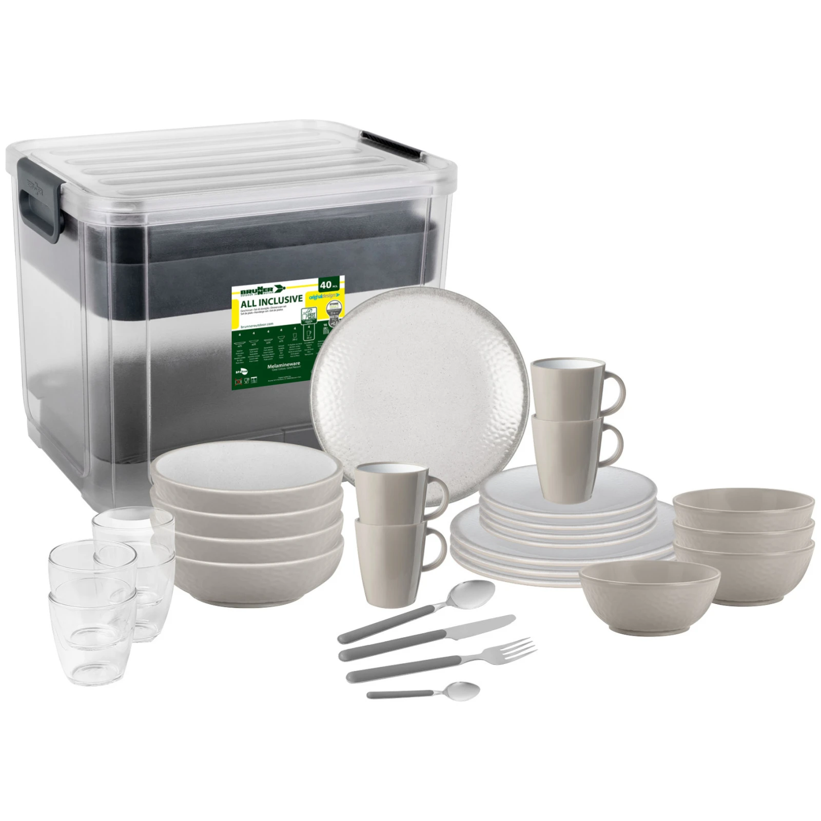 All Inclusive VIP Amadè ist ein hochwertiges Geschirrset, das alles beinhaltet, was Sie für gemütliche Mahlzeiten im Freien und unterwegs benötigen. Hochwertiges Melamin mit rutschfester Oberfläche sorgt für Stabilität, während das elegante Design einen Hauch von Luxus verleiht. Im Set sind neben Tellern und Bechernauch Gläser und ein komplettes Bestecksetenthalten, sodass es Ihnen an nichts fehlt. Dank seiner Beständigkeit gegen heiße Flüssigkeiten bis 90 °C und seiner langen Lebensdauer eignet er sich optimal für Camping, Caravaning und Gartensitze.
