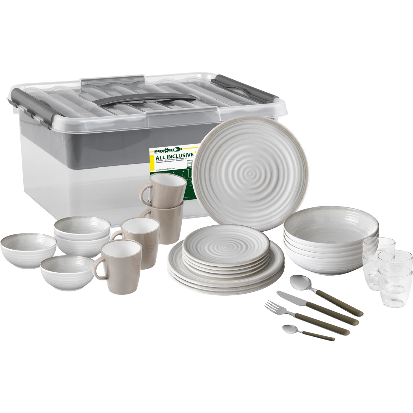 Das Granada All Inclusive VIP Brunner Geschirr-Set beinhaltet insgesamt 40 Teile, welche aus einer Kombination aus Melamin und Mineralstaub für Unzerbrechlichkeit sowie Anti-Rutsch-Gummi bestehen.