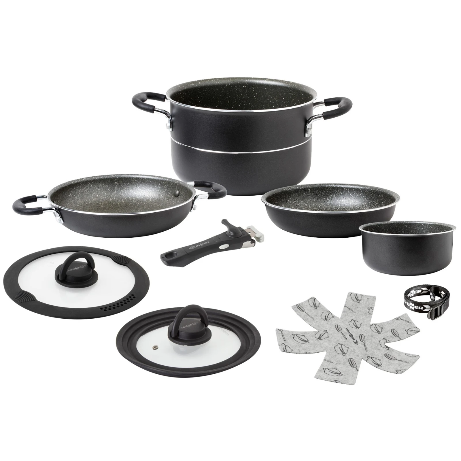 Pirate NG 7+1 – 22 cm der Marke Brunner ist ein leichtes und langlebiges Kochgeschirr-Set aus recyceltem Aluminium, das eine Antihaft-Oberfläche bietet.