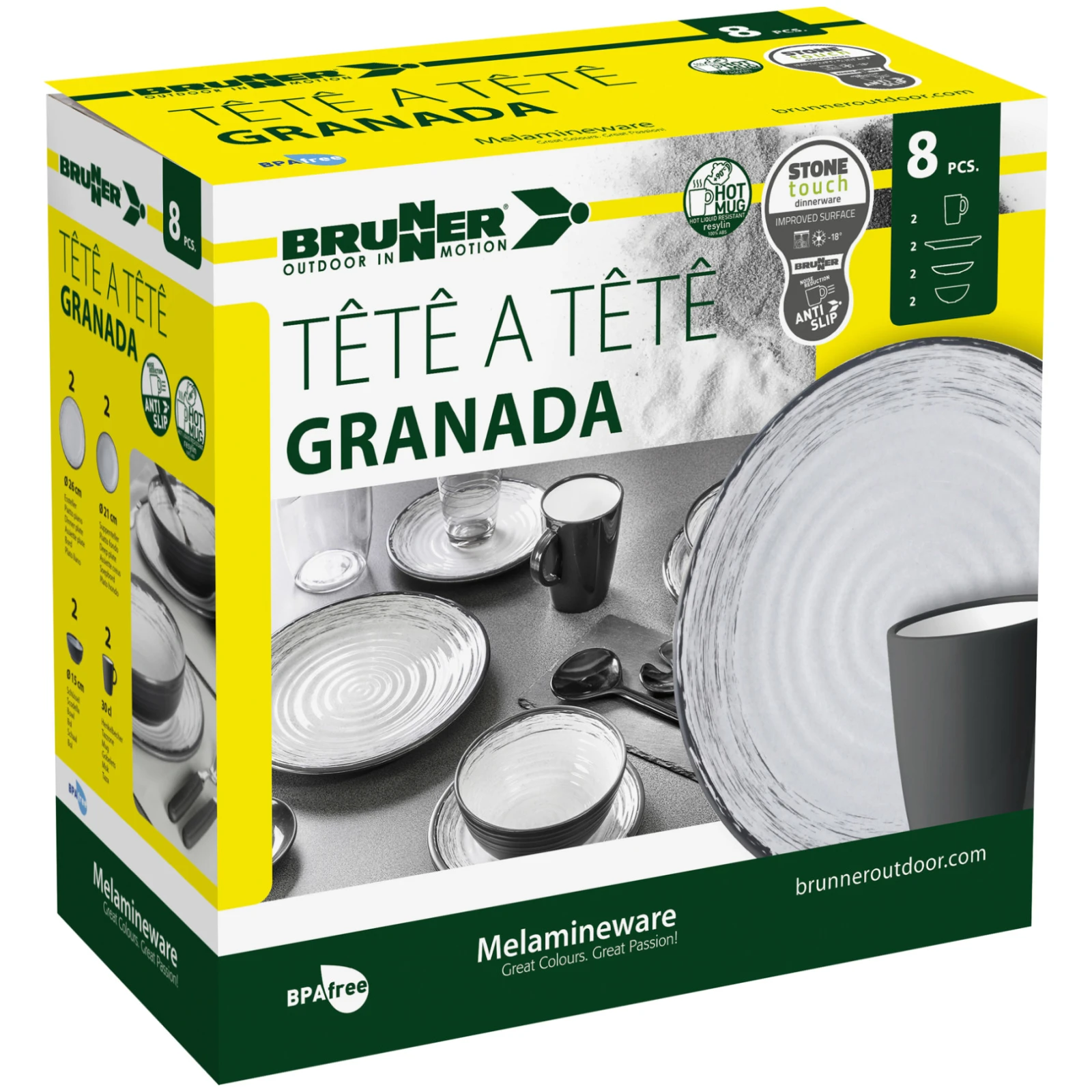 Das Tête-à-Tête-Set Granada ist ein elegantes Melamin-Geschirrset für zwei Personen. Das leichte und langlebige Design mit rutschfester Oberfläche ist ideal für Camping, Reisen und Mahlzeiten im Freien.