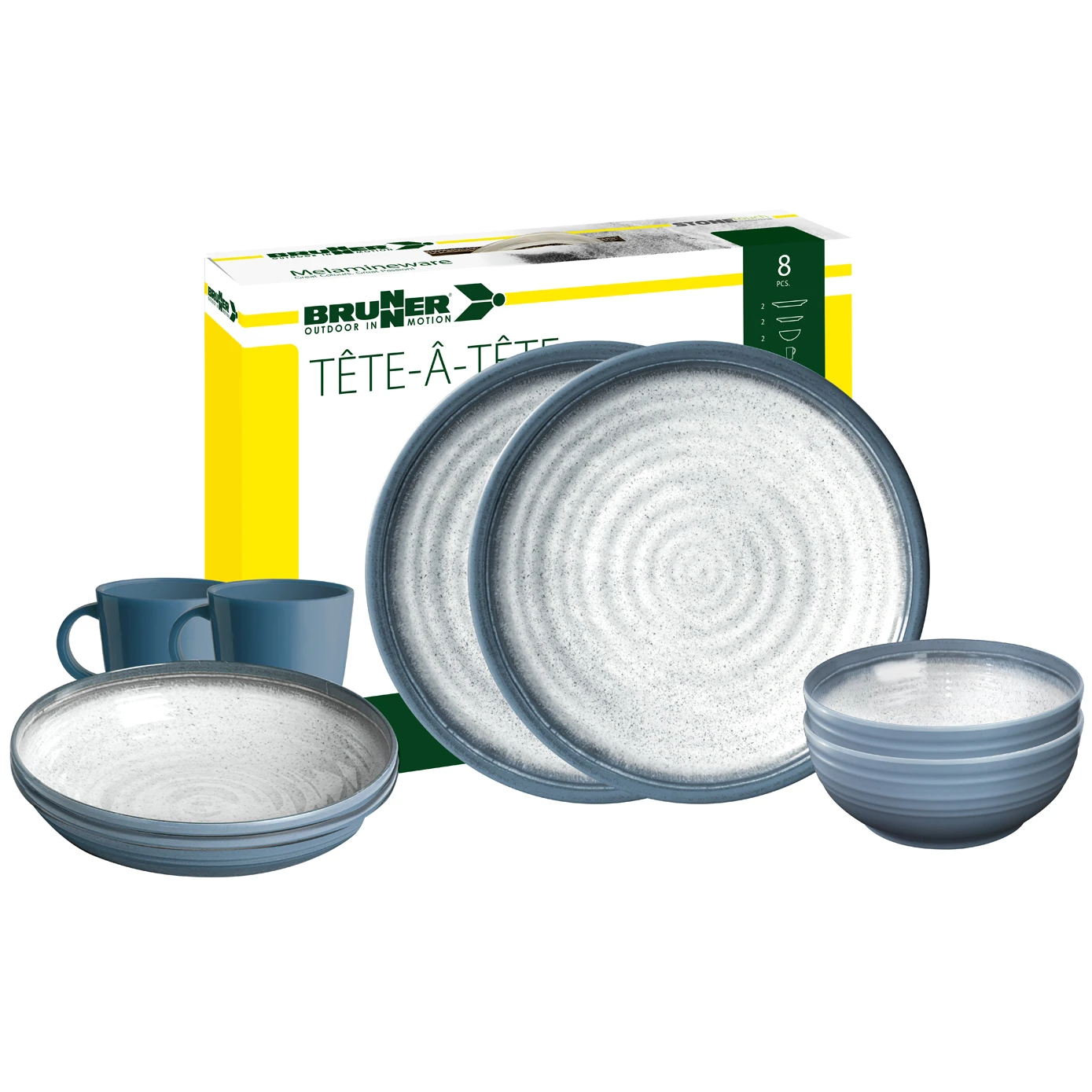 Das Tête-à-Tête-Kochgeschirr-Set Tuscany Set der Marke Brunner beinhaltet eine grundlegende Campingausstattung. Das Set besteht aus 8 Tafelteilen und ist für 2 Personen geeignet. Beim Camping werden Sie die erhöhte Haltbarkeit dank Melaminsicherlich zu schätzen wissen. Dieses Material ist schlagfest, leicht zu reinigen, hitze- und feuchtigkeitsbeständig, geruchs- und geschmacksneutral sowie umweltfreundlich. Geschirr kann in den Gefrierschrank und die Spülmaschine gestellt werden.