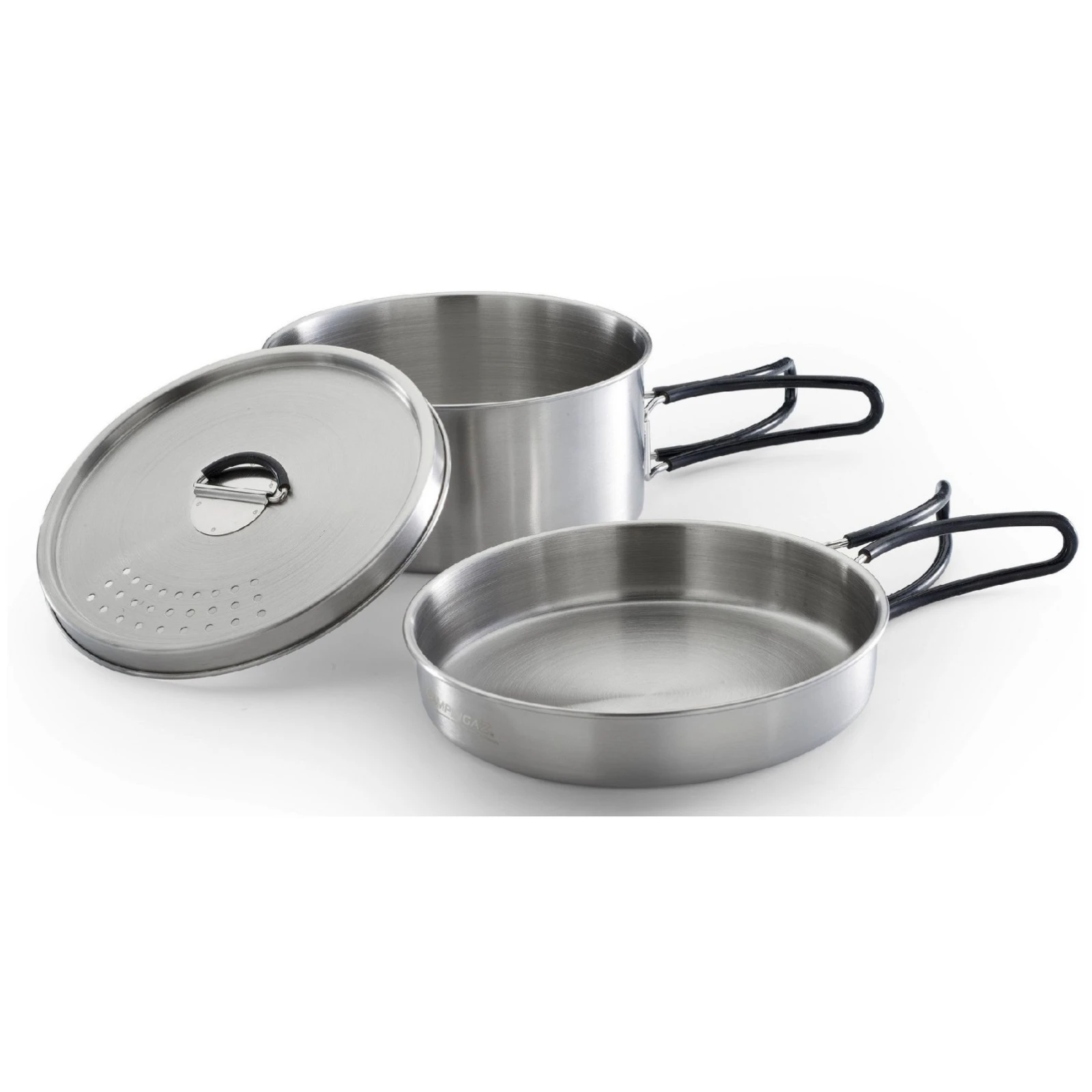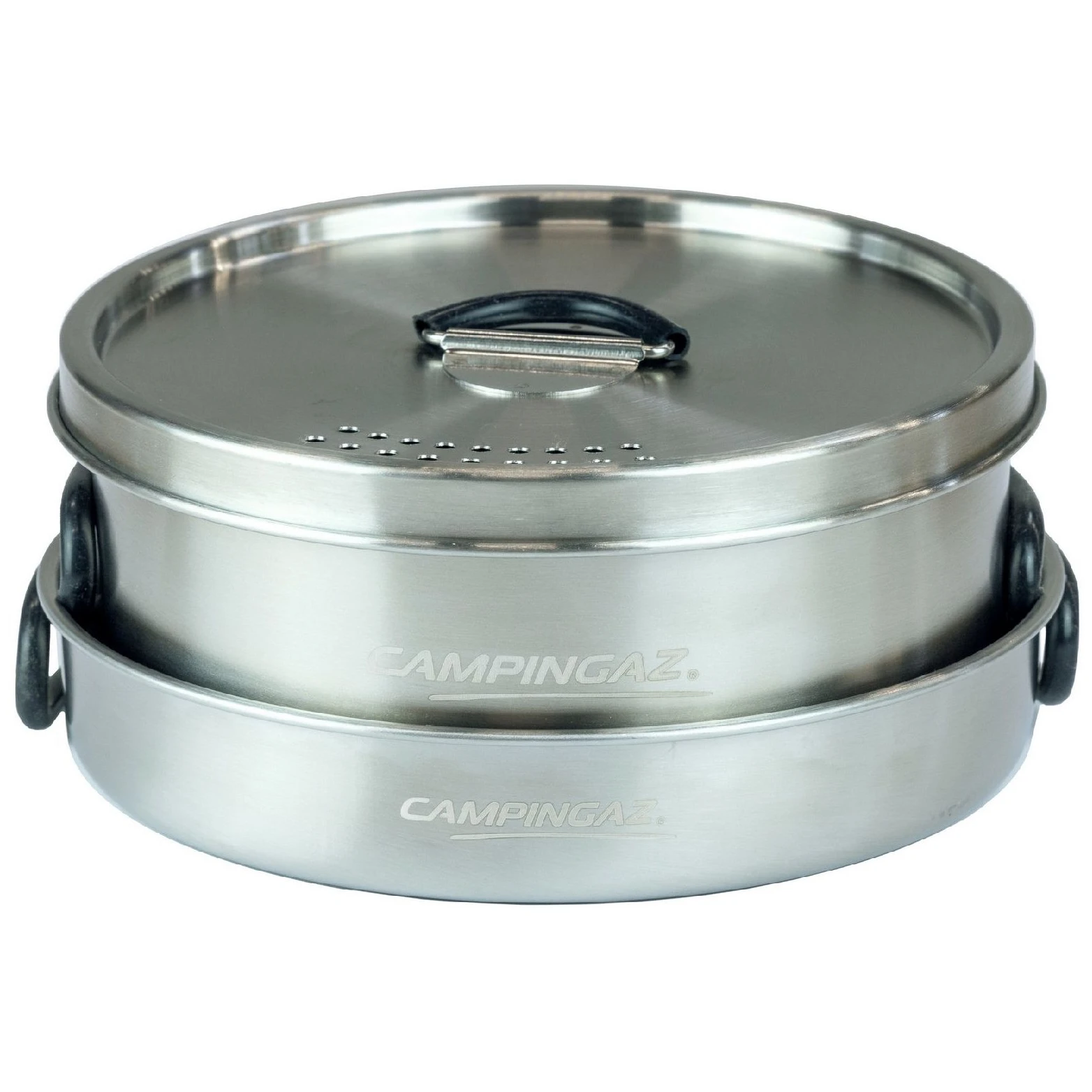 Trekkingbesteck der Marke Campingaz aus rostfreiem Edelstahl und mit Silikongriff. Im Lieferumfang sind ein Topf mit Deckel und eine Bratpfanne enthalten. Aufgrund seiner Abmessungen ist er für Rucksacktouristen geeignet.
