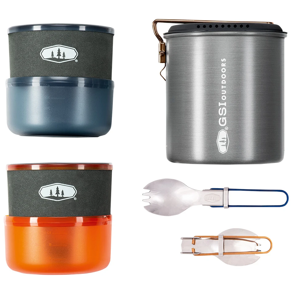 Kompaktes, ultraleichtes, kleines Kochgeschirr-Set für 2 Reisende Halulite MicroDualist vom Hersteller GSI Outdoors, in dem auch noch ein Gaskocher samt Kartusche Platz findet.