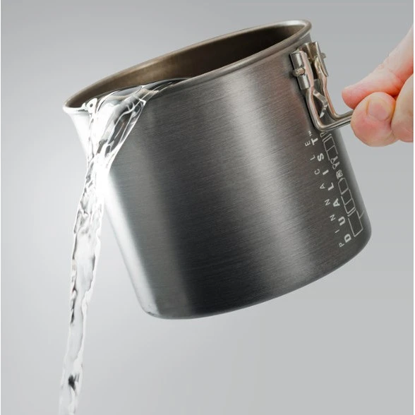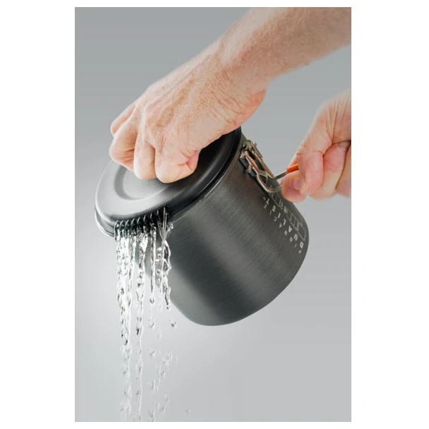 Die Oberfläche des Geschirrs wird durch eine Pinnacle-Behandlung geschützt. Zusätzlich kann im Set noch eine 220 g Gaskartusche zusammen mit einem Gaskocherenthalten sein. Der gelochte Deckel lässt Dampf problemlos aus dem Topf entweichen und kann zugleich als Abtropfsieb zum Ausgießen des Wassers aus dem Topf genutzt werden. Der Kochtopf verfügt über einen klappbaren Griff, der das Kochen deutlich angenehmer macht. Zwei mit Neopren umwickelte Becher und zwei Schüsseln zeichnen sich durch ihren niedrigen Schwerpunkt aus, der ein Umkippen der Behälter verhindert. Der Deckel des Bechers kann gleichzeitig als Trinkbecher verwendet werden. Die Verpackung des gesamten Sets kann als Wasserbehälter oder sogar als Spüle zum Geschirrspülen dienen.