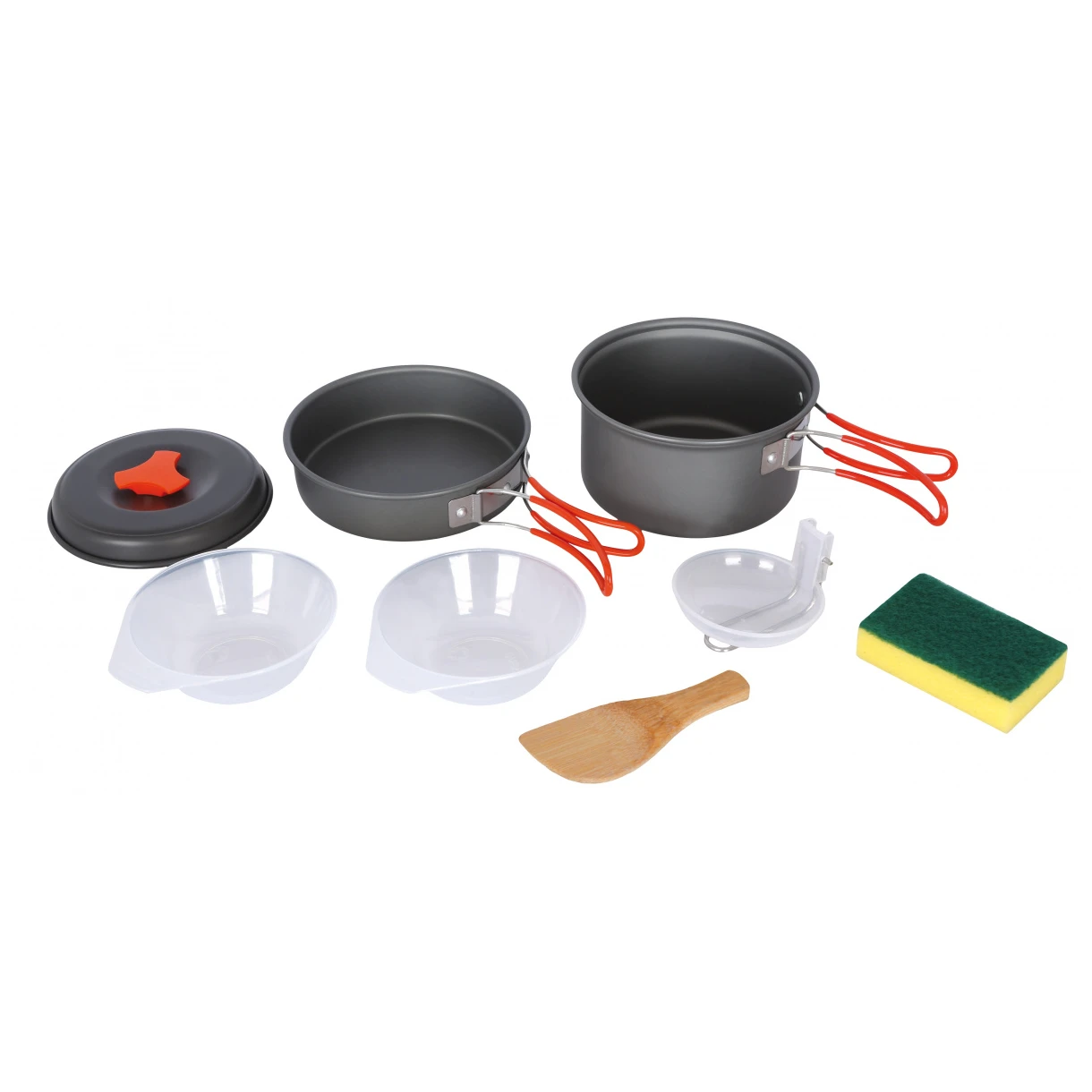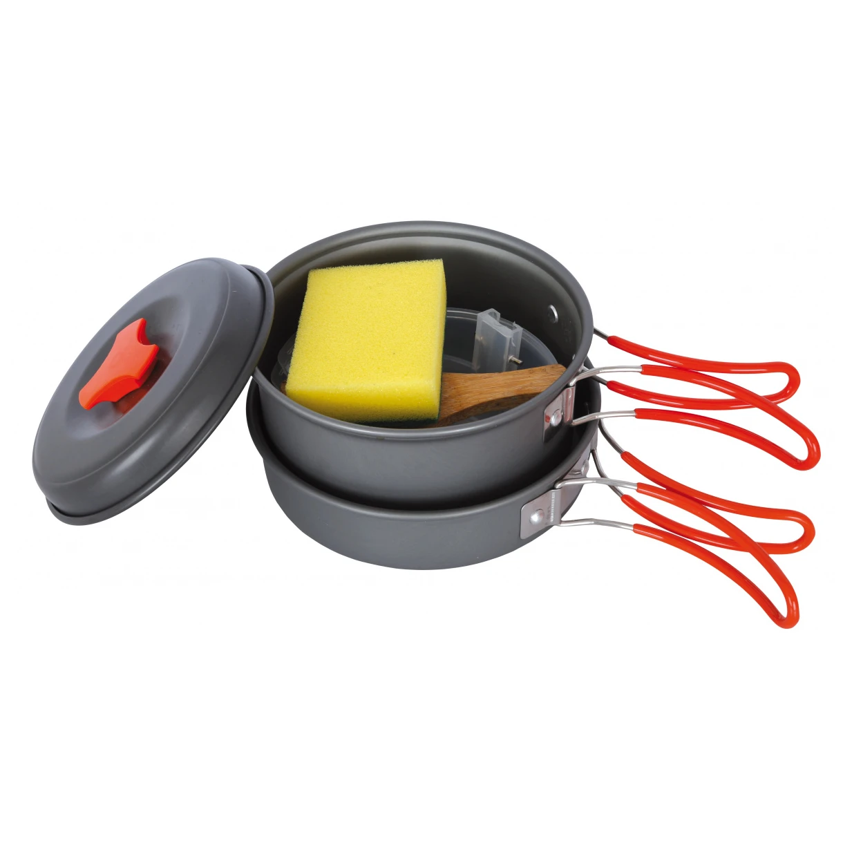 Universelles Kochgeschirr-Set aus Aluminium. Enthält einen Topf und eine Pfanne. Ideal für Ausflüge in die Natur, bei denen geringes Gewicht und Kompaktheit erforderlich sind.