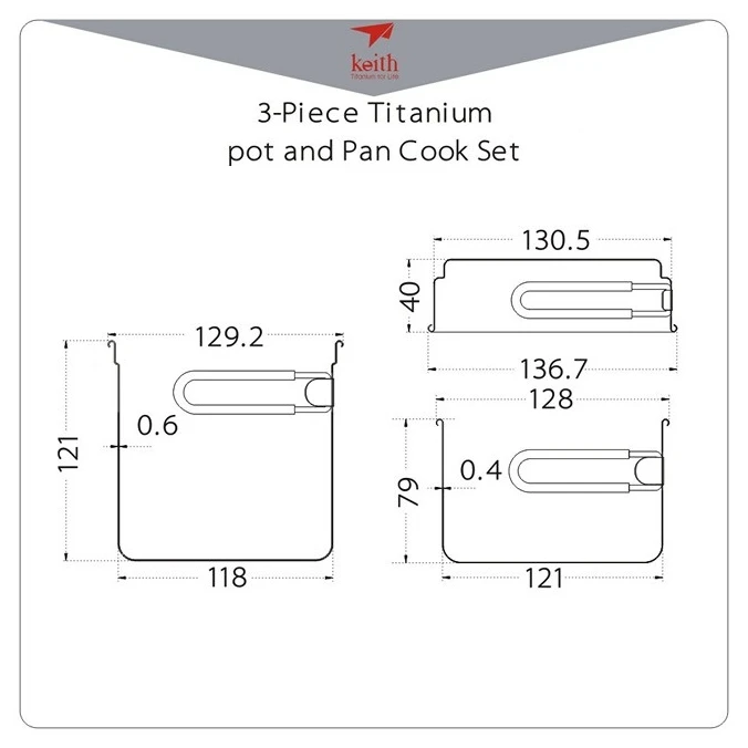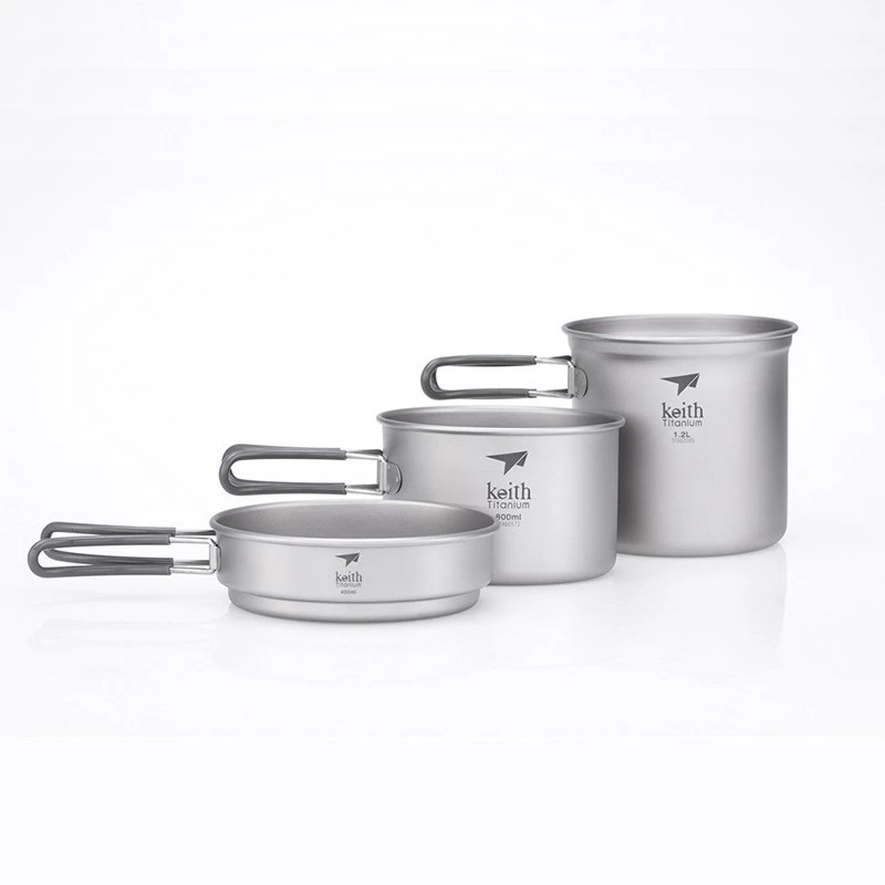 Dreiteiliges Kochset aus Titan 3-teiliges Topf- und Pfannen-Kochset Keith Titanium, das zwei Töpfe in den Größen 800 ml und 1200 ml und eine 400 ml Pfanne umfasst, die auch als praktischer Deckeldient. Jedes Teil ist mit klappbaren Griffen mit Silikonbeschichtung ausgestattet. Das gesamte Set besteht aus Titan, das hervorragende Eigenschaften garantiert und zudem ein unbedenkliches, umweltfreundliches Material ist, das gegenüber extremen Temperaturen beständig ist. Titan zeichnet sich durch seine Festigkeit aus und ist aufgrund seiner Dichte fast 50 % leichter als Stahl.
