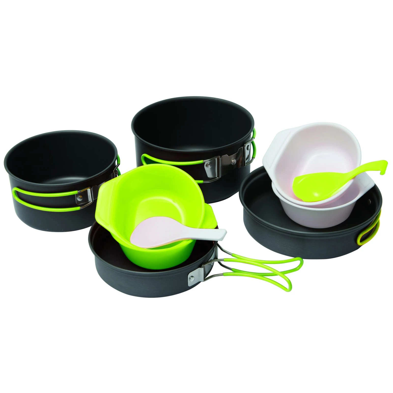 Tafelgeschirr Pinguin Quadri ist ein Geschirrset aus gehärtetem Aluminium für 3-5 Personen, das alles enthält, was Sie zum Kochen im Freien benötigen, einschließlich Schüsseln und Besteck.
