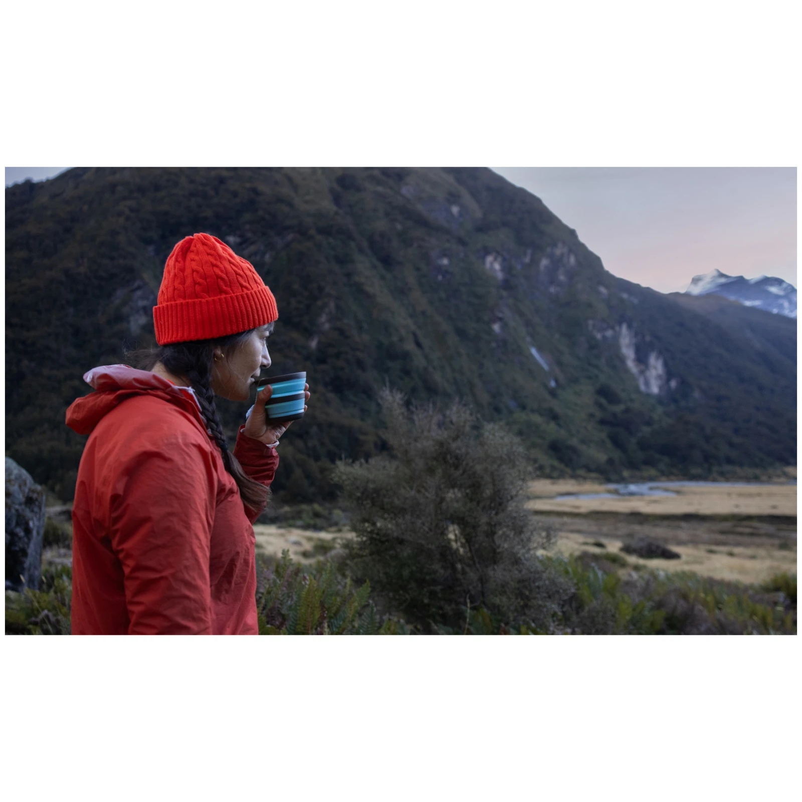 Die neue leichte Konstruktion dieses Sets bedeutet eine weitere Gewichtsreduktion. Jede Schüssel hat jetzt einen Rand, der das Festhalten erleichtert. Zusätzlich zum oberen Rand gibt es auch einen Mittelstreifen, der das Greifen bei heißen Getränken vereinfacht. Jeder Artikel lässt sich auf eine Höhe von ca. 2 cm zusammenfalten, wobei Becher und Schüssel ineinander passen. Dadurch eignet sich das Set ideal für eine kompakte Verpackung.