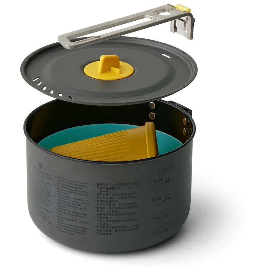 Das Frontier UL One Pot Cook Set 1.3L Kochgeschirr-Set von Sea to Summit umfasst einen Topf mit einem Fassungsvermögen von 1,3 l, eine Schüssel mit einem Fassungsvermögen von 680 ml und einen Becher mit einem Fassungsvermögen von 355 ml. Sie können alles bequem im Topf verstecken und mit einem einzigartigen abnehmbaren Griff sichern.