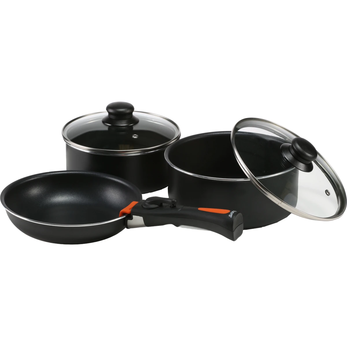 Das hochwertige Gourmet Kochset von Vango mit Antihaft-Oberfläche ermöglicht effizientes Kochen und erleichtert den Abwasch erheblich. Es ist stapelbar, lässt sich daher leicht verstauen und nimmt nicht viel Platz in Ihrem Auto ein. Der abnehmbare Griff ist für alle Töpfe und Pfannen im Set geeignet und vor allem platzsparend. Das Set ist mit allen Herdarten kompatibel, einschließlich Induktionskochfeldern.