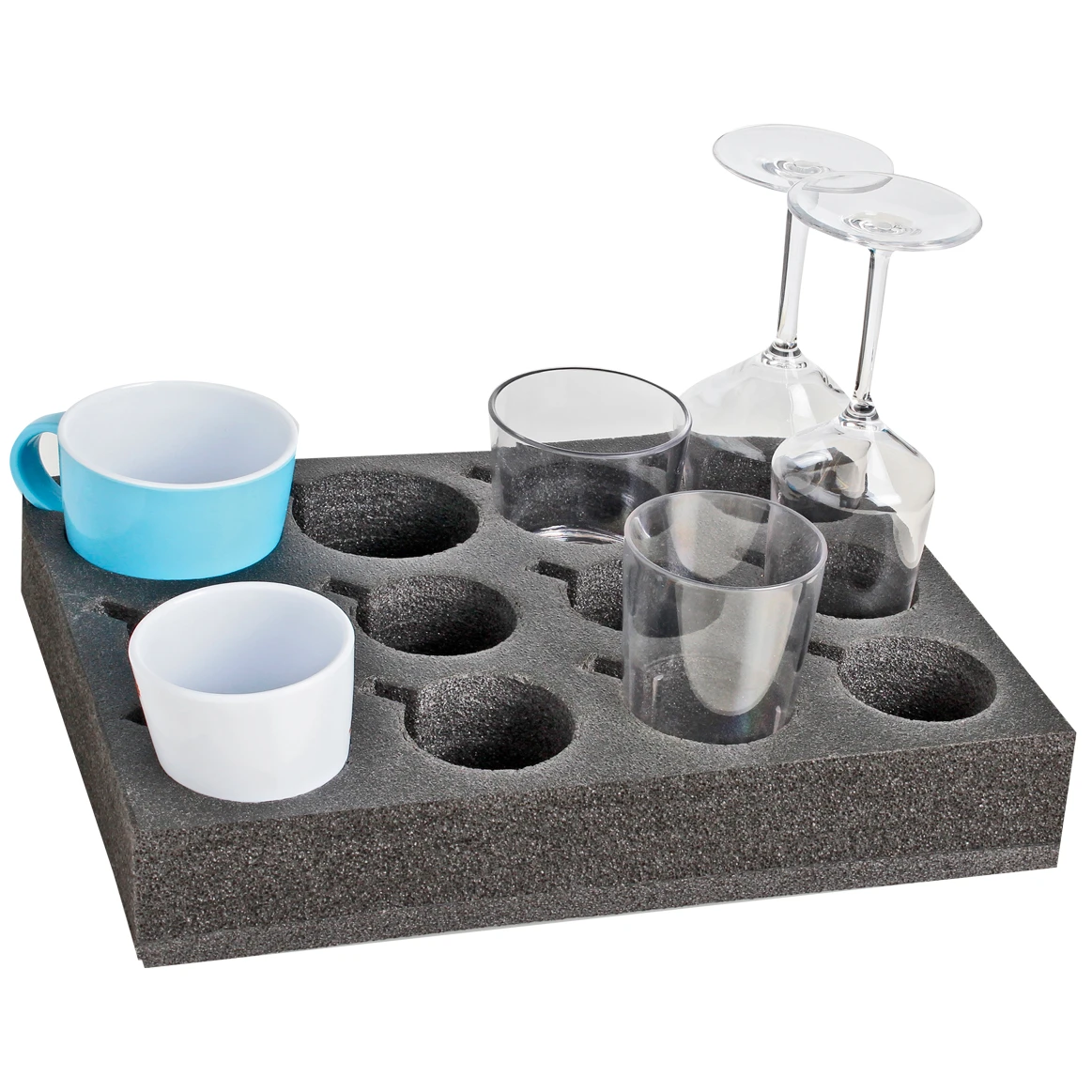 Der Salvar-Halter der Marke Brunner ist die perfekte Wahl für unterwegs, im Wohnwagen oder Wohnmobil. Er sorgt dafür, dass Gläser, Becher oder Gefäße an ihrem Platz bleiben und nicht umkippen oder verschüttet werden. Der Halter besteht aus weichem Schaumstoff und bietet Platz für bis zu 12 Gläser oder Tassen. Ergänzt werden diese Löcher durch Platz für den Henkel des Bechers.