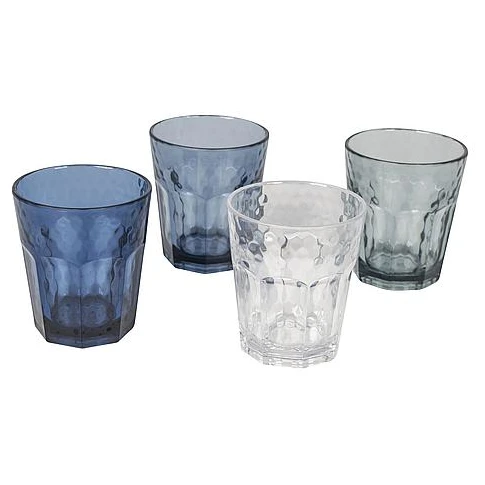 Das Kunststoff Mix and Match 4-Gläser-Set der niederländischen Firma Bo-Camp ist ideal für Wein oder Limonade. Jedes Glas hat einen anderen Blauton, wodurch ein verspielter und gemütlicher Effekt entsteht.