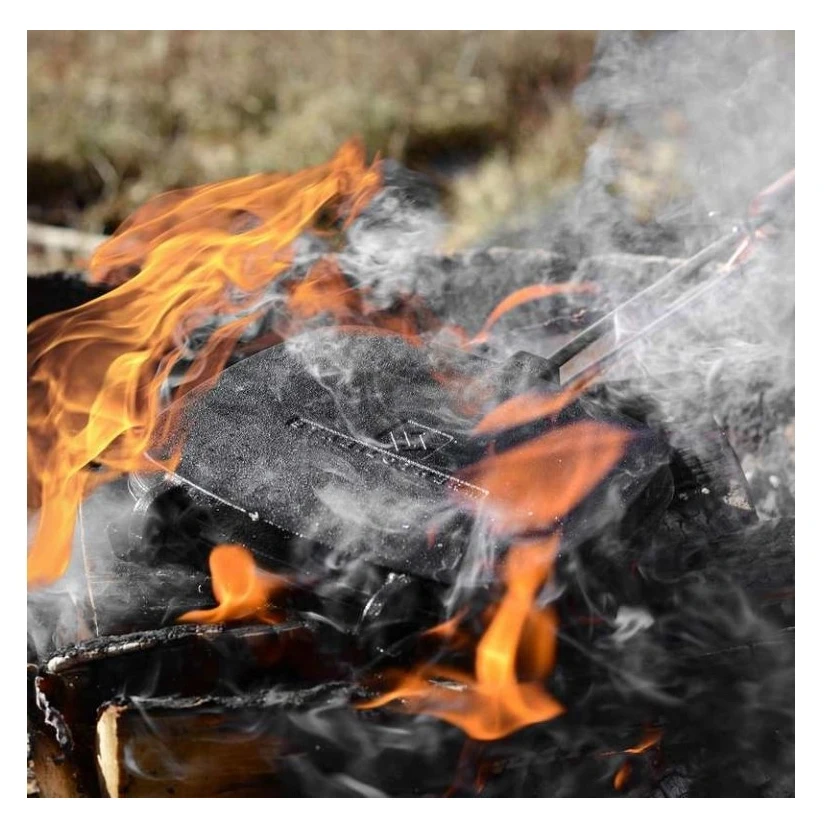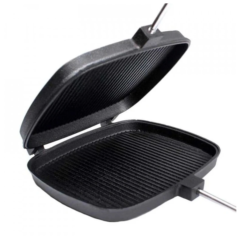 Der Kontaktgrill aus Gusseisen ist mit Holzgriffen und langen Stielen ausgestattet, sodass Sie aus sicherer Entfernung über offenem Feuer grillen können. Ideal für Sandwiches, Hamburger, Fleisch oder Wurst. Einfache und gesunde Zubereitung leckerer Gerichte direkt auf dem Feuer.