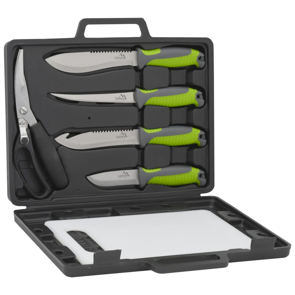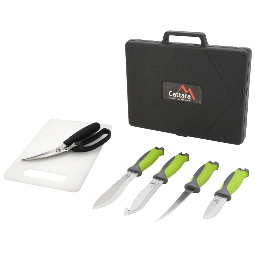 Grillset Cattara 4+1+1 bestehend aus 4 Messern, Geflügel- und Fischschere und einem Schneidebrett zum bequemen Portionieren. Das gesamte Set ist ordentlich in einem Transportkoffer untergebracht.