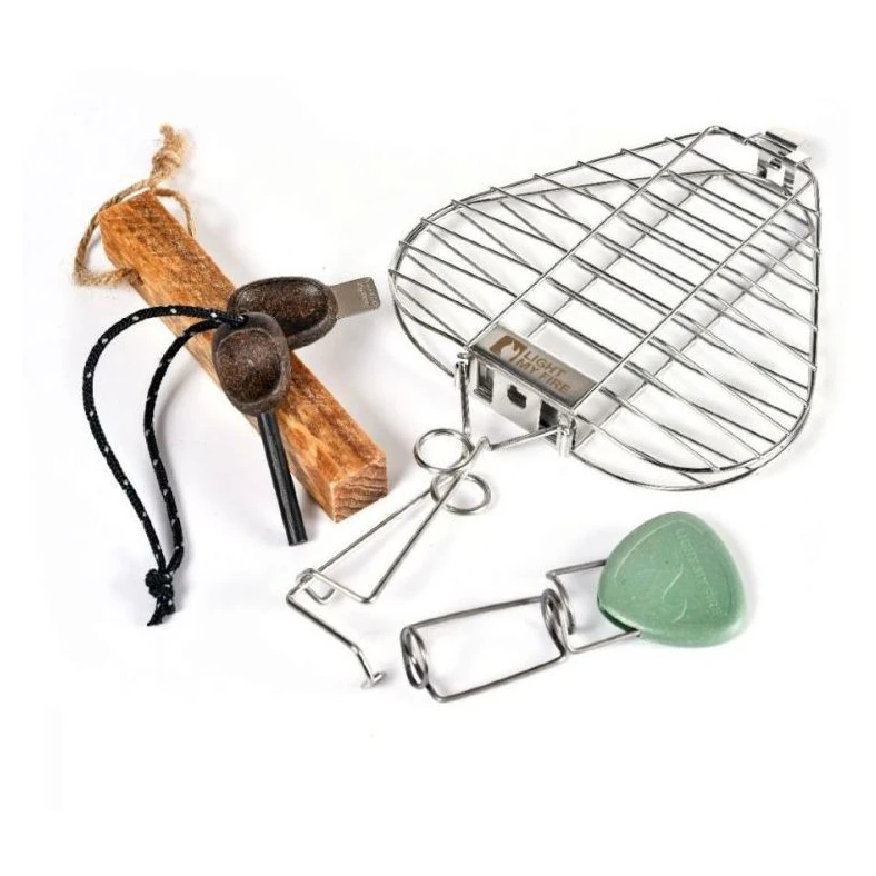 Ein tolles Grillset vom schwedischen Hersteller Light My Fire, welches einen Grillrost, eine Bratengabel, einen Feuerstein und Anzündholz beinhaltet.