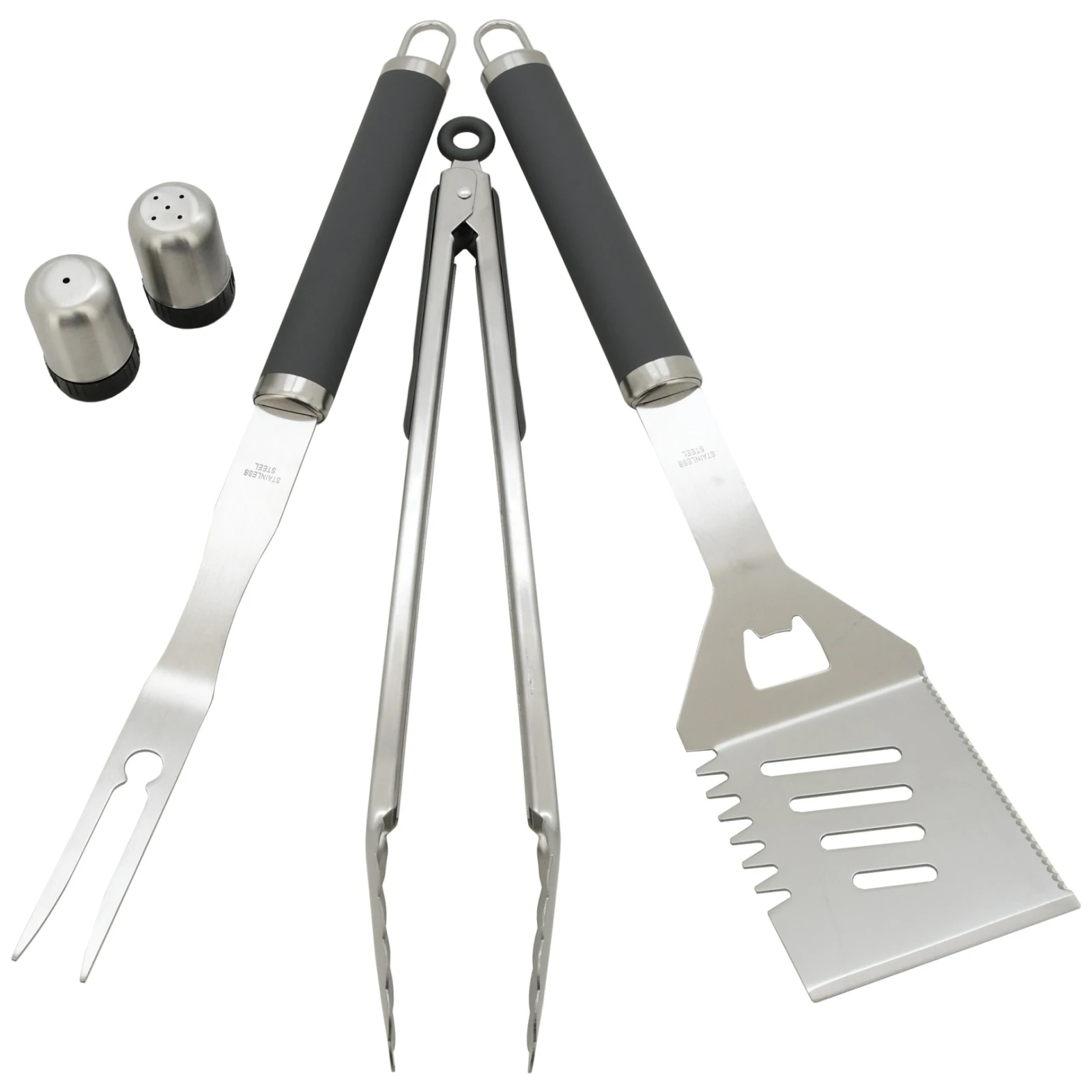 Die Zange ist zum sicheren Greifen fettiger Lebensmittel gezahnt und 40 cm lang. Zweizinkige Gabel mit einer Länge von 44 cm. Ein Wendewerkzeug mit einer Länge von 43,5 cm und einer präzise geschliffenen Kante, Zacken und Abflusslöchern zum Wenden von Fleisch und anderen Gerichten.