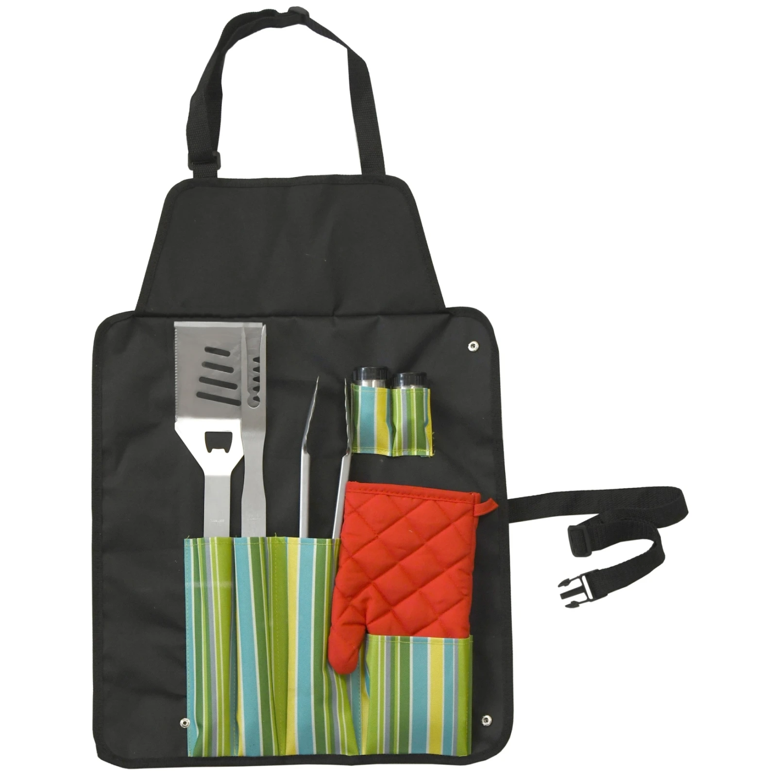 Grillbesteck-Set 7-tlg. + Schürze Cattara bestehend aus einer Schürze mit Taschen und Salzstreuer, einem Pfefferstreuer, einem Handschuh und klassischen Werkzeugen wie Wender, Gabel und Zange.