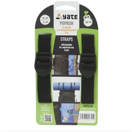 Zwei praktische Spanngurte mit Kunststoffschnalle, 75 cm lang und 2 cm breit, mit einer Tragkraft von 50 kg von der Firma Yate. Ein Band aus Vollmaterial hat ein sehr breites Anwendungsspektrum. Es dient zum bequemen Herunterziehen einer aufgerollten Isomatte, aber auch zur Befestigung von Material an Rucksack etc.