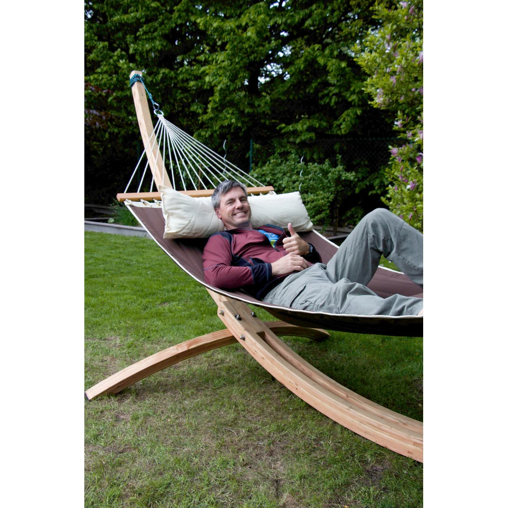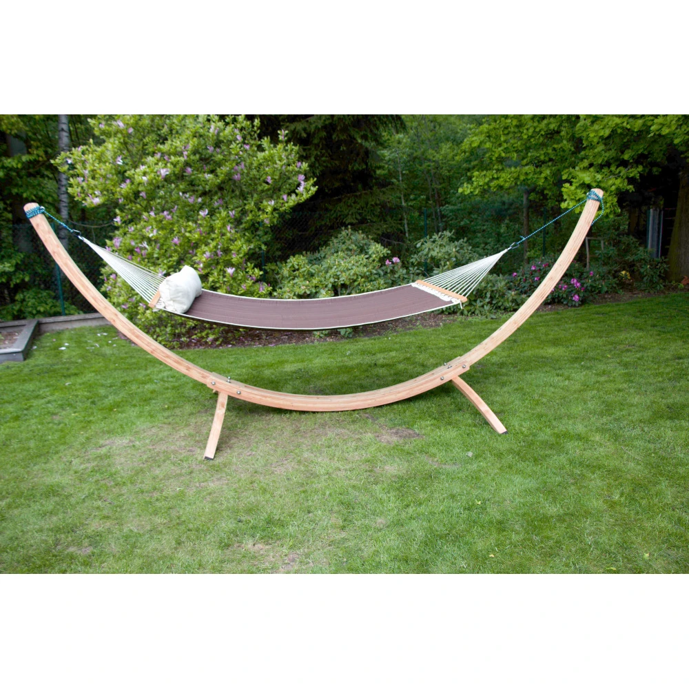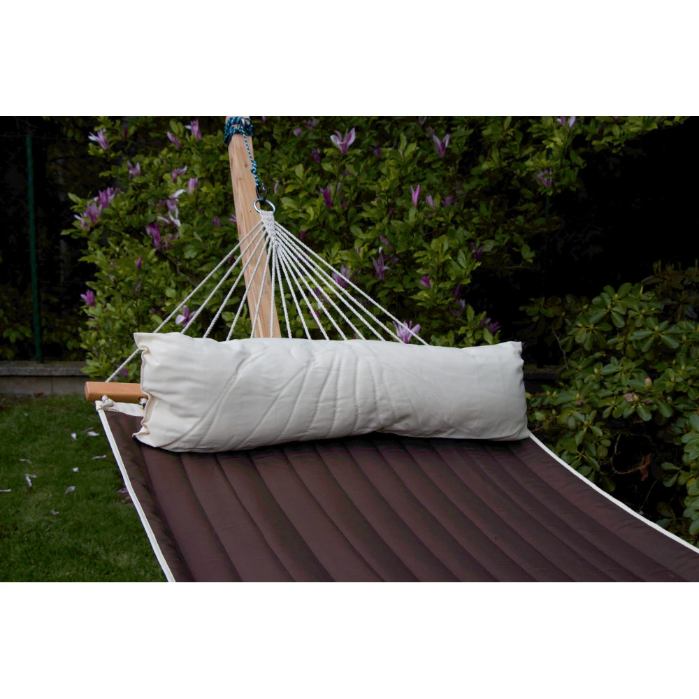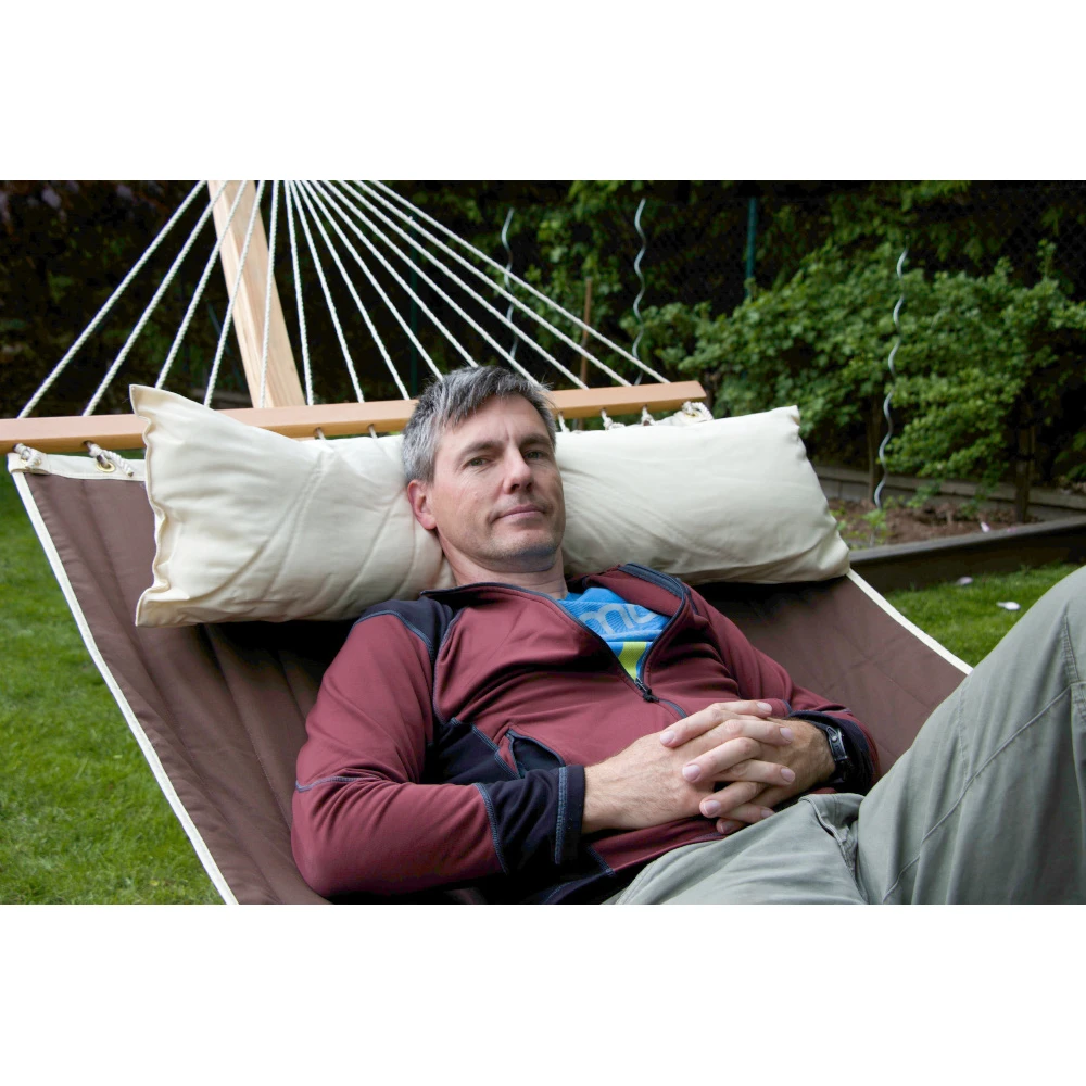 Hängematte Hamaka Exclusive sorgt dank ihres gesteppten Materials für bequemes Ausruhen, egal ob Sie zu Hause oder am Pool entspannen. Zwei Lagen Polypropylenfaser mit gesteppter Wattierung sind wetterbeständig. Die Holzstäbe halten das Netz in Form und sorgen so für bequemeres Hinlegen und Aufstehen.