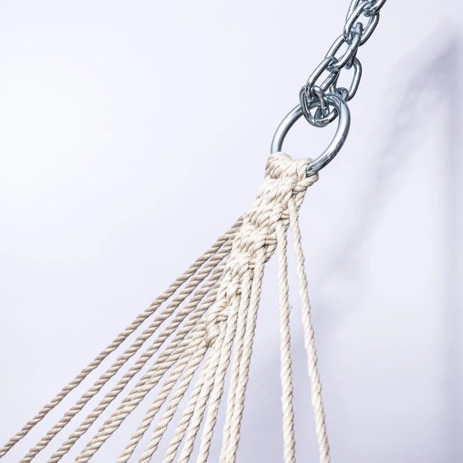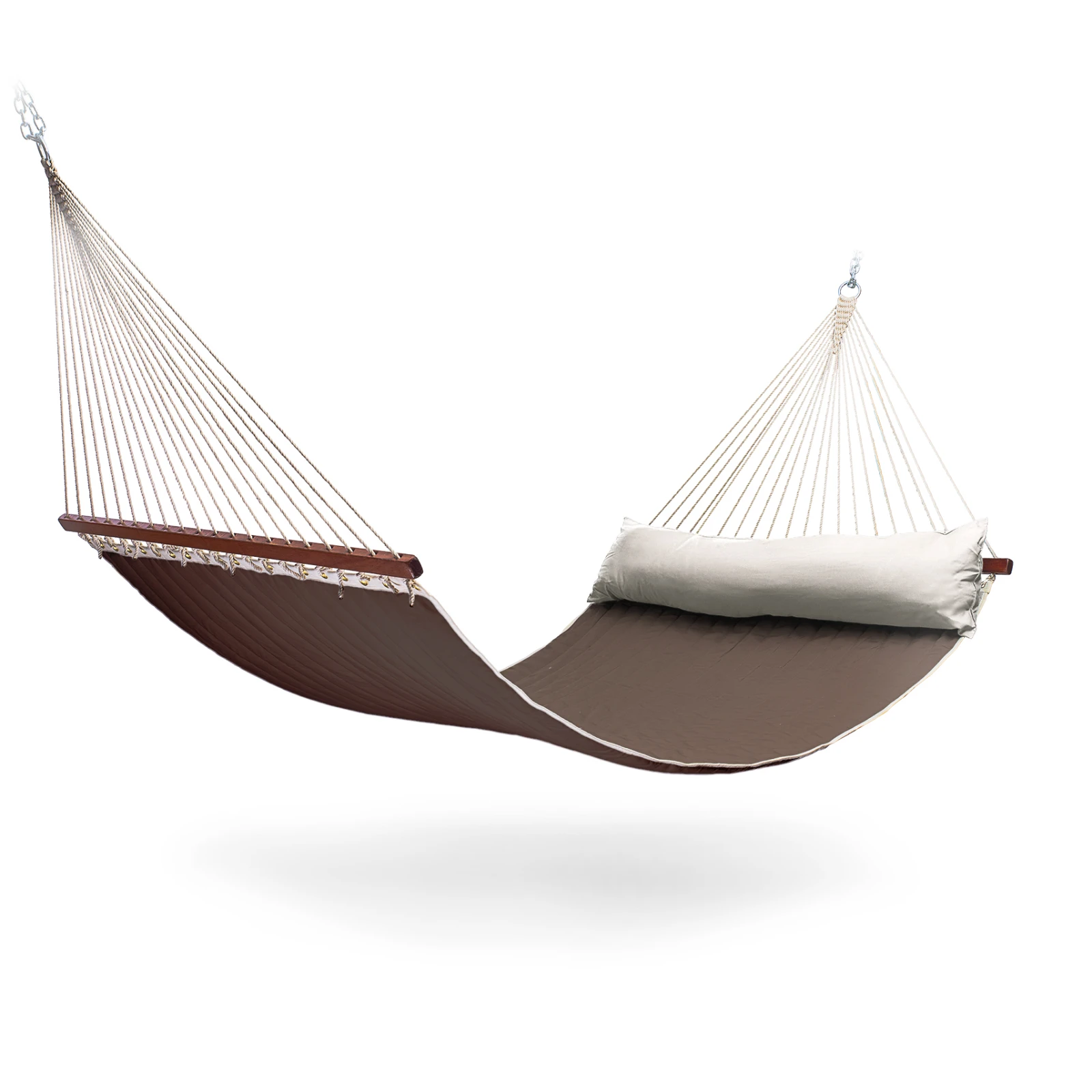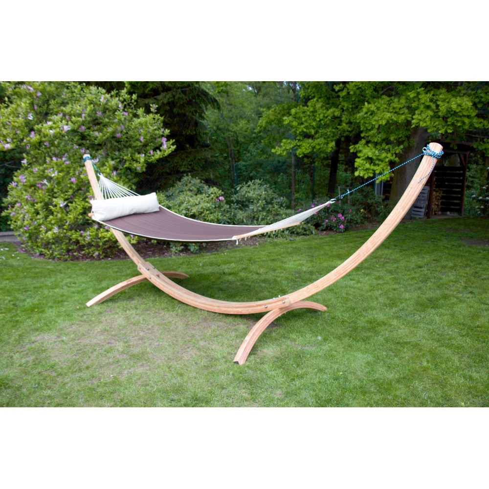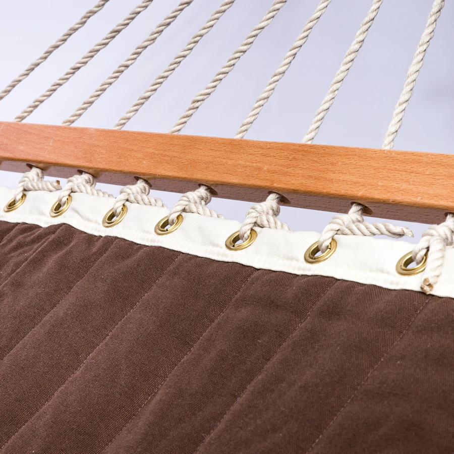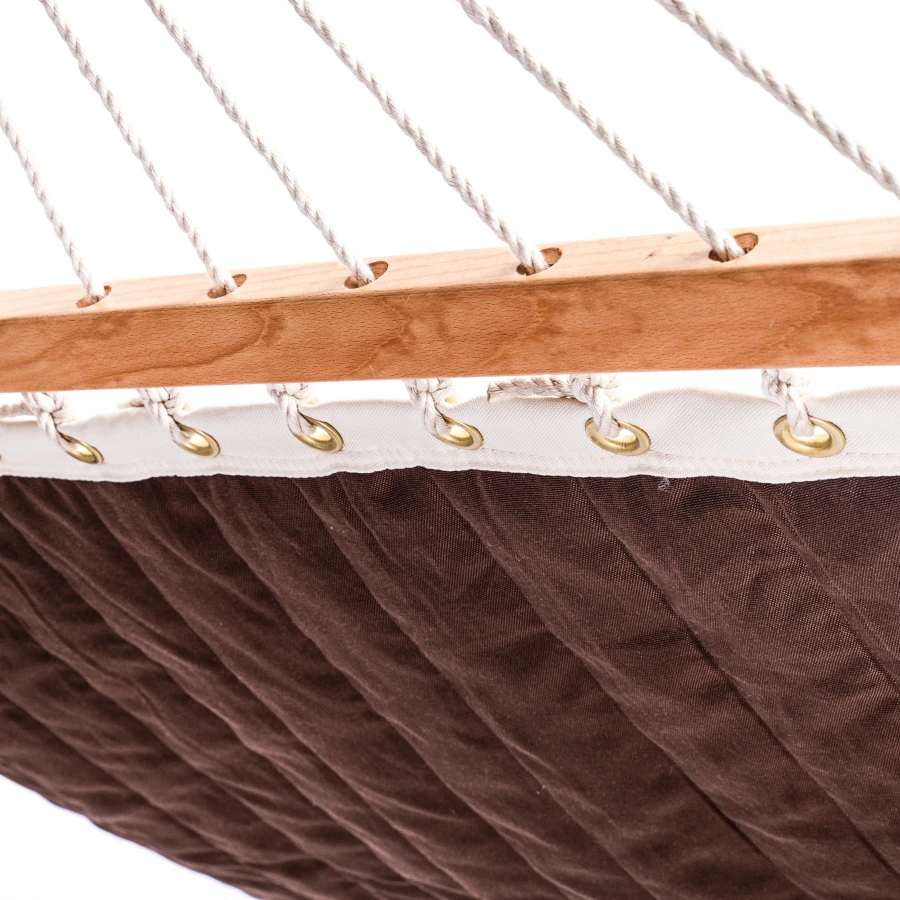 Hängematte Hamaka Exclusive sorgt dank ihres gesteppten Materials für bequemes Ausruhen, egal ob Sie zu Hause oder am Pool entspannen. Zwei Lagen Polypropylenfaser mit gesteppter Wattierung sind wetterbeständig. Die Holzstäbe halten das Netz in Form und sorgen so für bequemeres Hinlegen und Aufstehen.